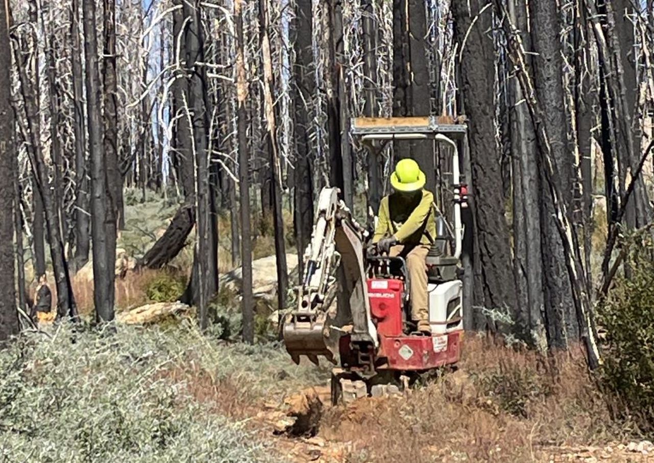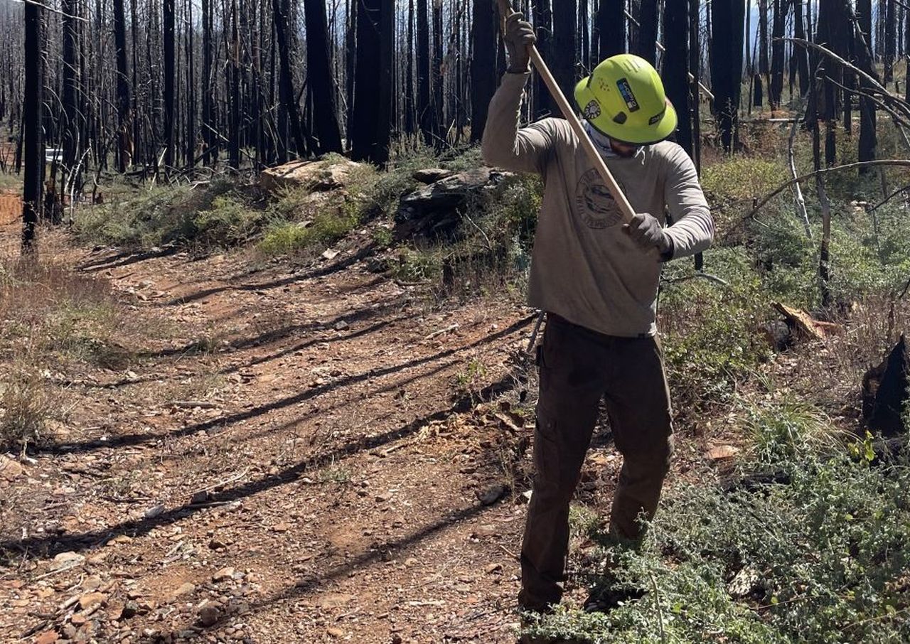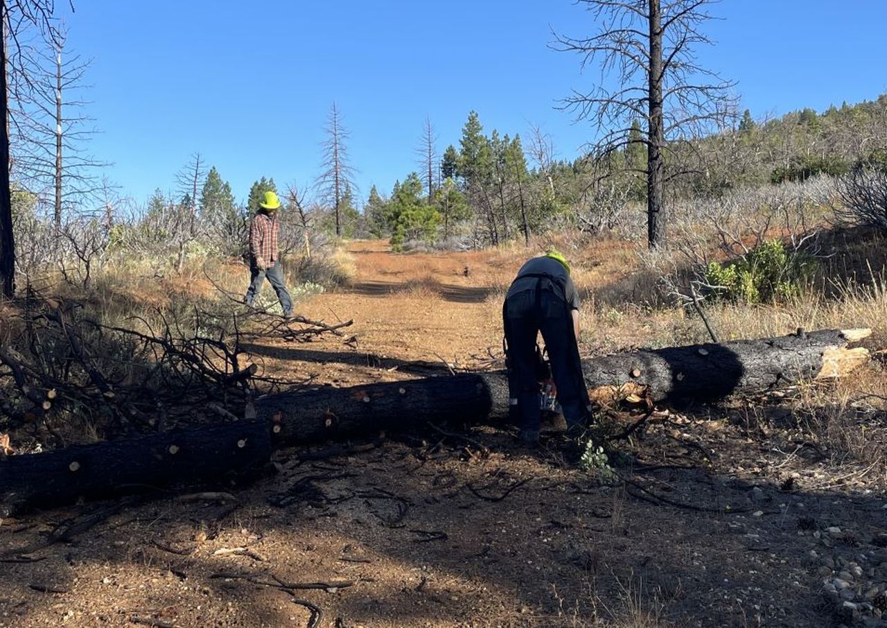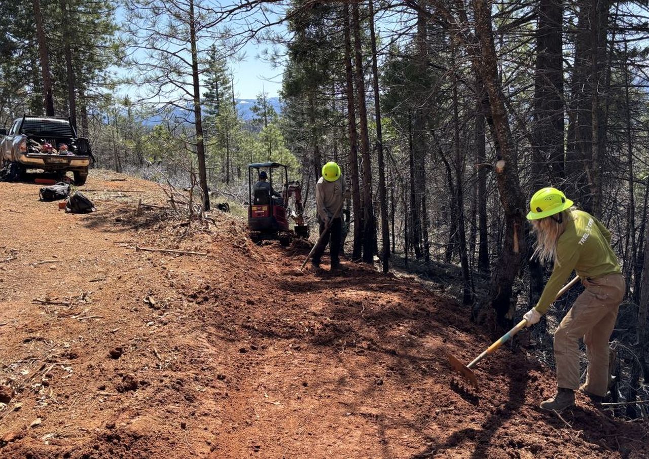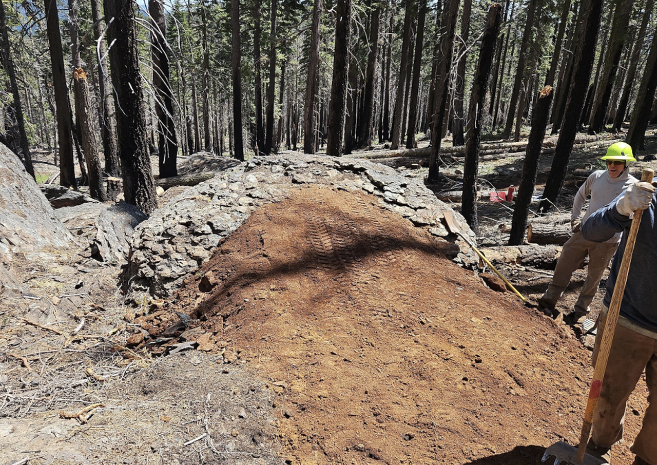 The project took place over two weeks in September 2025, combining volunteer support with the expertise of a professional trail crew. To staff the project, SBTS turned to its own three workers, seven volunteers from Feather River College’s Outdoor Recreation Leadership Program, and a mini-excavator to clear the way for new drains.