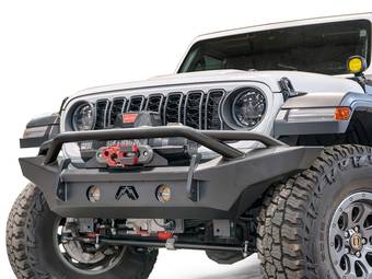 Popularized by the Jeep community, stinger front bumpers are similar in construction to a base bumper, yet typically feature a narrow “stubby” width and integrated tubular “stinger” hoop. Unlike a prerunner bar or bull bar, stingers are long and pointed. Their upward angle is engineered to serve as a ramp in extreme off-road conditions—by contacting obstacles before the Jeep’s front end, a stinger enables a Jeep to climb up and over obstacles without damage.