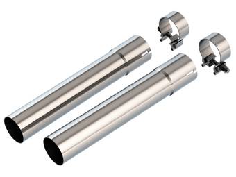 Underbody of a vehicle showing modified exhaust system with stainless steel pipes and muffler.