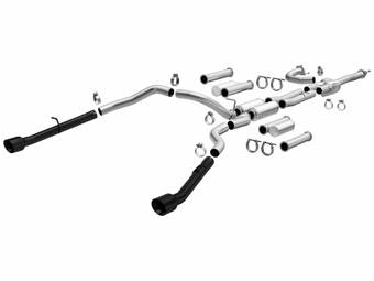 Axle-back exhaust systems replace only your vehicle’s rear exhaust section, which usually consists of items behind the rear axles, like rear exhaust pipes, mufflers, and exhaust tips. These systems typically leave your vehicle’s factory B-pipe, or “mid-pipe,” intact, offering moderate performance gains and decibel increases. However, considering they include fewer components, they're typically less expensive and easier to install.
