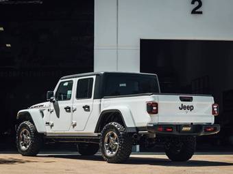 Rear view of a white Ford vehicle with off-road modifications and aftermarket bumper.