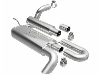 Axle-back exhaust systems replace only your vehicle’s rear exhaust section, which usually consists of items behind the rear axles, like rear exhaust pipes, mufflers, and exhaust tips. These systems typically leave your vehicle’s factory B-pipe, or “mid-pipe,” intact, offering moderate performance gains and decibel increases. However, considering they include fewer components, they're typically less expensive and easier to install.