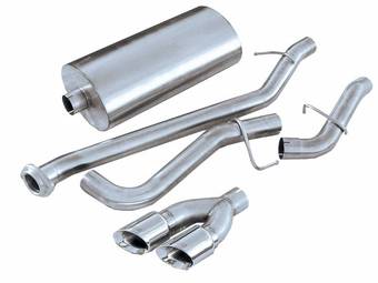 Underbody of a vehicle showing modified exhaust system with stainless steel pipes and muffler.