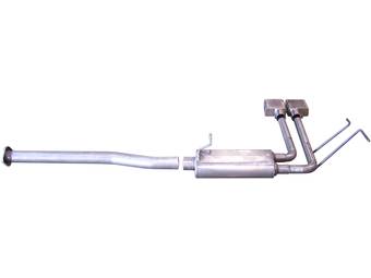 Underbody of a vehicle showing modified exhaust system with stainless steel pipes and muffler.