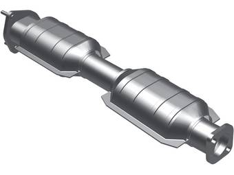 Underbody of a vehicle showing modified exhaust system with stainless steel pipes and muffler.