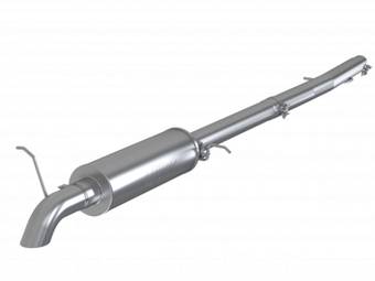 Underbody of a vehicle showing modified exhaust system with stainless steel pipes and muffler.