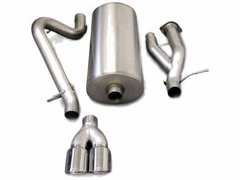 Underbody of a vehicle showing modified exhaust system with stainless steel pipes and muffler.