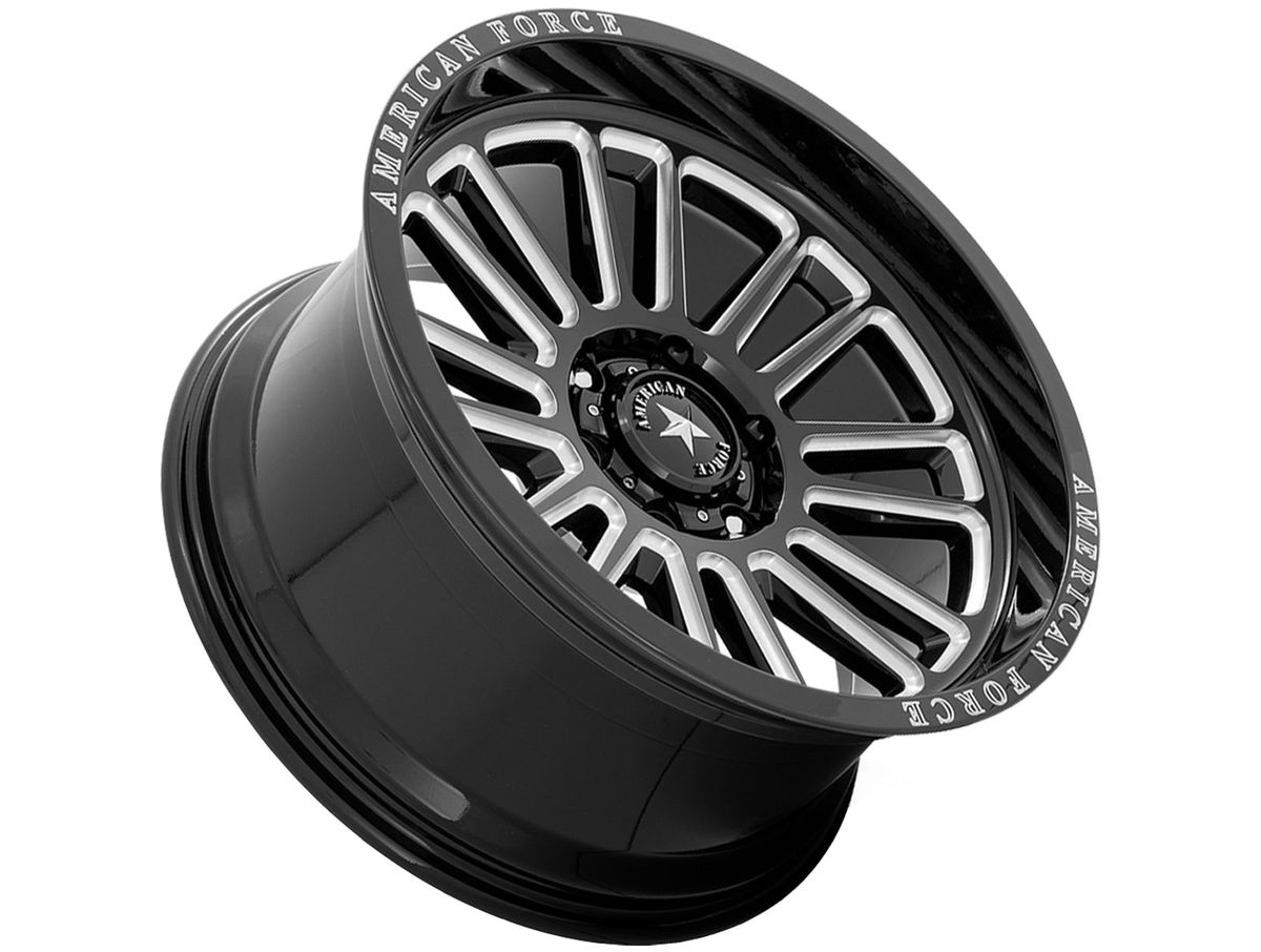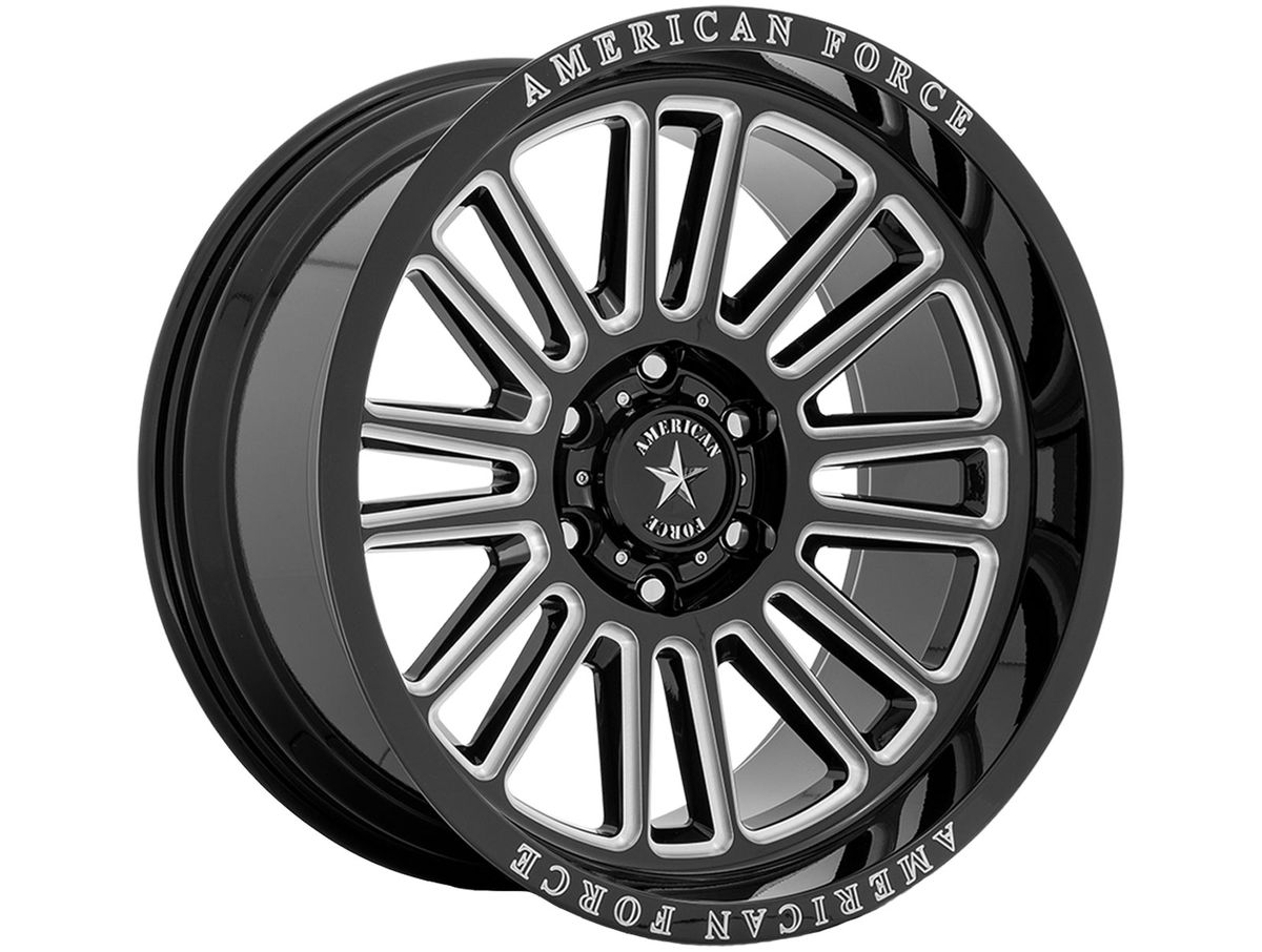 Each spoke features milled accents that wrap toward the center of the wheel and meet at the center cap. The wheel is covered in a gloss black finish that is offset with the brand name engraved around the outer edge. The center cap is adorned with the American Force logo to complete the look.