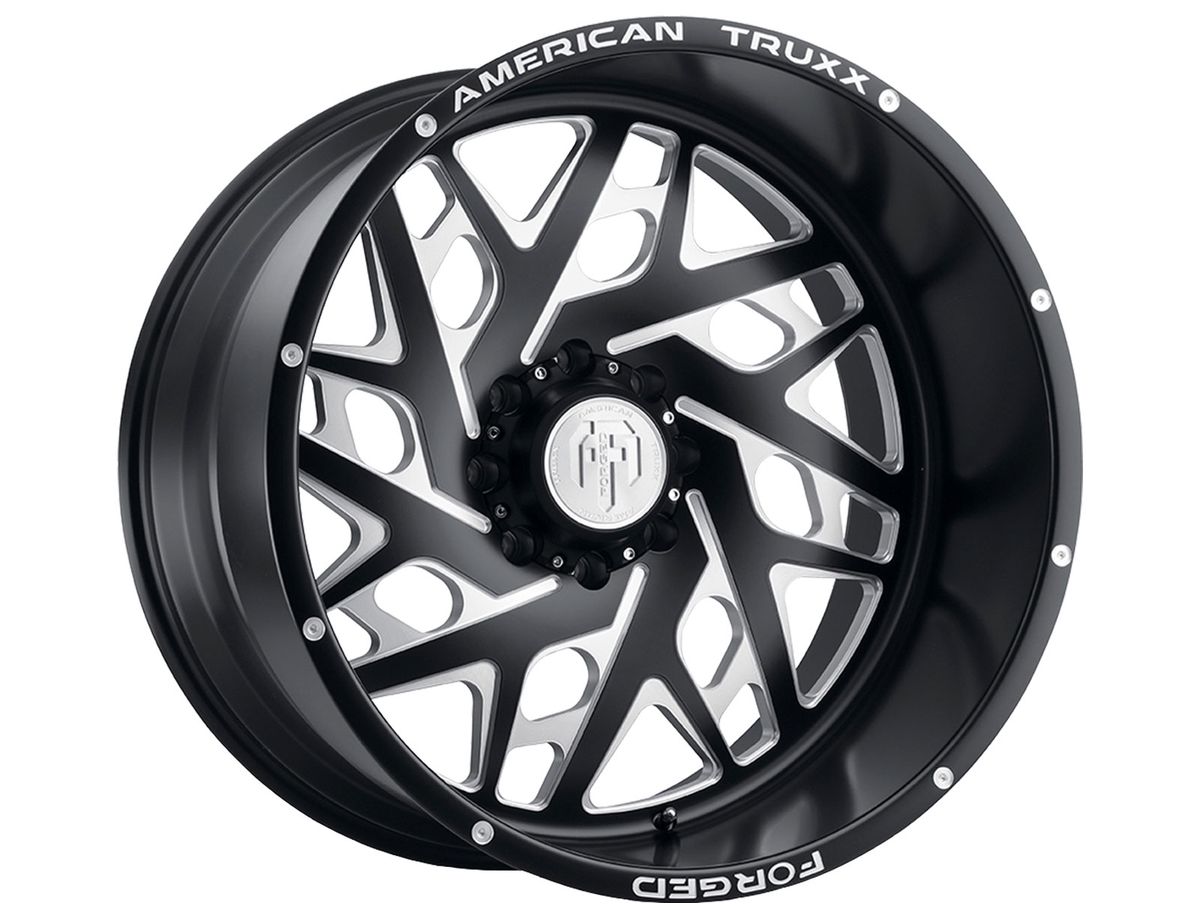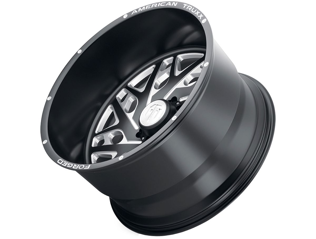 The spokes are split with multiple windows creating depth and contour. The wheel is covered in a matte black finish that is offset with spot milled accents around the outer edge. The lip of the wheel and the center cap are engraved with the American Truxx Forged logo to complete the look.
