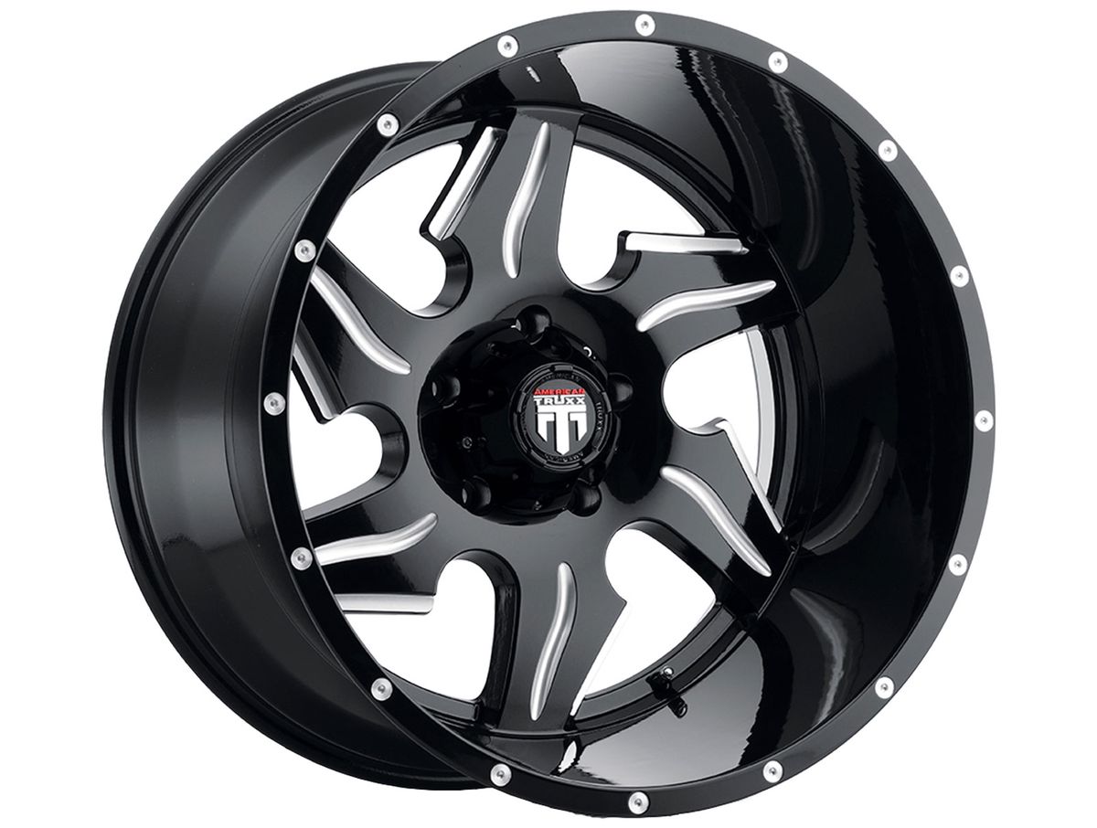 Each spoke features a milled accented groove going down the center to give it that sharp angled look. The wheel is covered in a gloss black finish that is offset with spot milled accents around the outer edge. And to finish off the look, the center cap is adorned with the American Truxx logo.