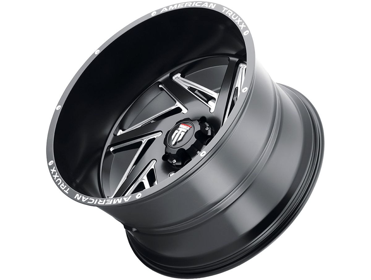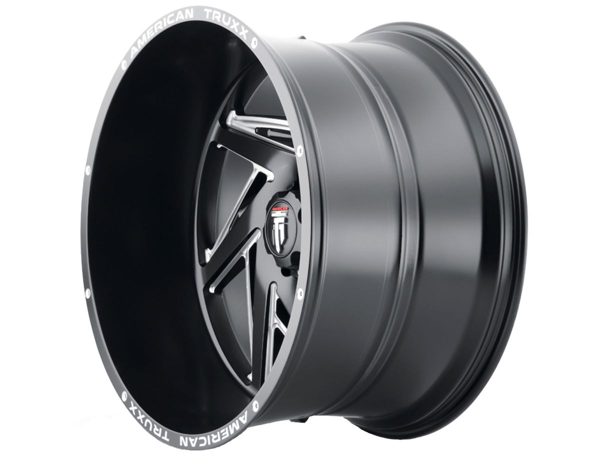 The wheel is covered in a matte black finish. There is also spot milled accents and American Truxx engraved around the outer edge. The center cap is adorned with the American Truxx logo to complete the look.