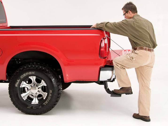 Simply kick the step down with a gentle nudge of a toe and whether the tailgate is open or not, you've got the boost needed for a comfortably and safe stepping experience. When your truck bed trip is complete and you're ready to step down, simply flip the pad up into its retracted place and go about your business. No bending over. No tracks to roll, no nothing! The best part - you'll hardly notice the step is there.