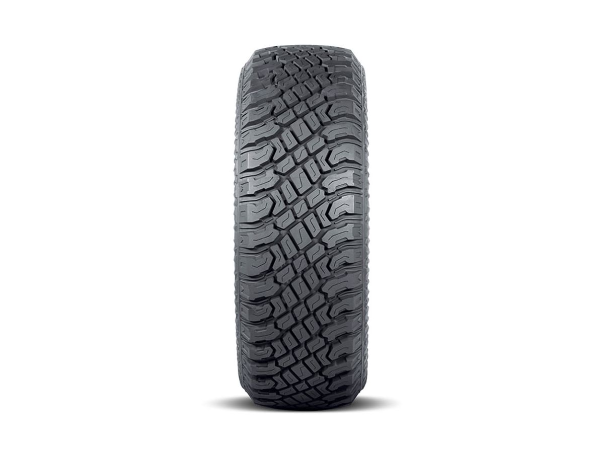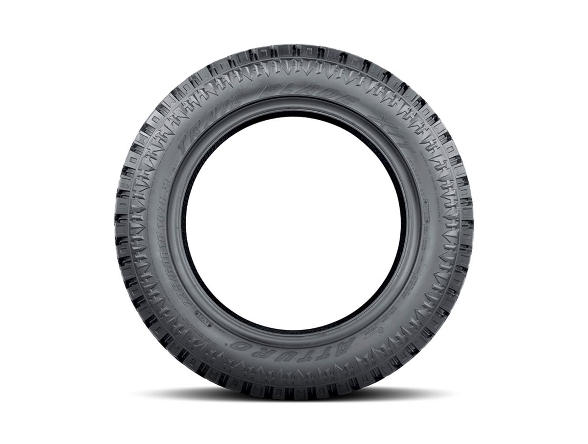 This hybrid tire gives you the best of both an MT and AT tire with an MT shoulder block and sidewall design combined with an AT center tread pattern that at home no matter where you are. Offered in original equipment and aftermarket sizes, there is a Trail Blade X/T for almost any application and the knife inspired design will make it look good anywhere. Large shoulder blocks borrowed a mud-terrain design, these deliver solid traction on off-road terrains. Staggered siping in the center tread blocks helps further reduce road noise and improve wet and snow traction. Linking the center tread blocks together at the base of the tread helps increase stability on the highway and reduce tread squirm. Stone ejectors at the base of the tread on the shoulder help reduce road noise and keep the shoulder area clear for water and snow evacuation. Modestly angled shoulder provides for a smoother handling feel while still allowing for deep shoulder lugs to keep good traction on the trail. Center tread blocks spaced closer together helps reduce road noise similar to an All-Terrain tire while providing channels to improve wet and snow traction. The Trail Blade X/T tires are covered by a 3-year standard limited warranty and a 45,000 mile treadwear warranty. Upgrade your ride with the Atturo Trail Blade X/T tires today!