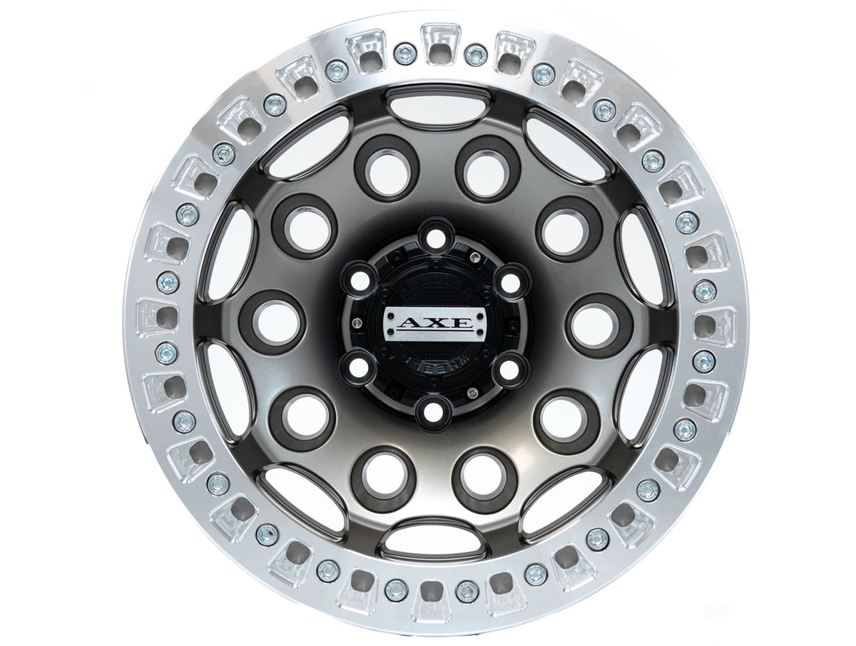 The wheel features a true beadlock design around the outer edge of the wheel which means this wheel is for offroad use only and not DOT approved. The wheel is covered in a grey finish with the beadlock ring covered in a polished finish. To complete the look, the center cap is adorned with the Axe logo.
