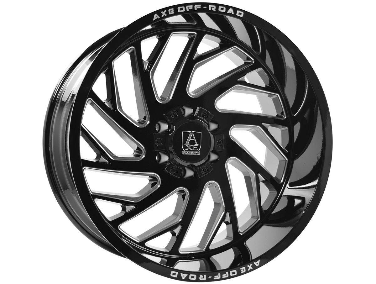 Axe Offroad Milled Gloss Black Zeus Wheels feature a rotational style with ten split y-spokes that fill up the face of the wheel. The split spokes feature milled accents creating depth and contour on the face of the wheel. Large diameters and mesh designs are what Axe Offroad specializes in, and the Zeus puts those features on display.