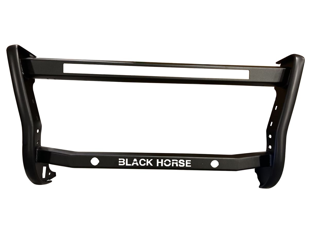 Protect your vehicle’s front-end components while enhancing its look with a robust grille guard, like the Black Horse Rambler Grille Guard! Featuring a unique, modernized design and durable steel construction with a sleek black finish, this guard adds a bold touch to any truck or SUV. Made from tough 4-gauge steel, it offers excellent durability and impact resistance. For added protection against rust and abrasions, the grille guard is coated in a premium matt black powder coat finish, providing a striking look that lasts. The guard includes interior and auxiliary light mounts with pre-drilled holes, allowing you to easily install an LED light bar or dual pods for improved visibility in low-light conditions. Black Horse also offers a complete grille guard package with your choice of red or black 5.3-inch auxiliary LED flood lights, a 30" LED single row light bar, or both! Installation is straightforward with a simple bolt-on process, and the kit comes complete with all required mounting brackets, hardware, and instructions specific to your vehicle, making it perfect for an easy, at-home installation. Also, it’s backed by a 3-year limited warranty from Black Horse, ensuring coverage against defects in materials or workmanship during the warranty period!