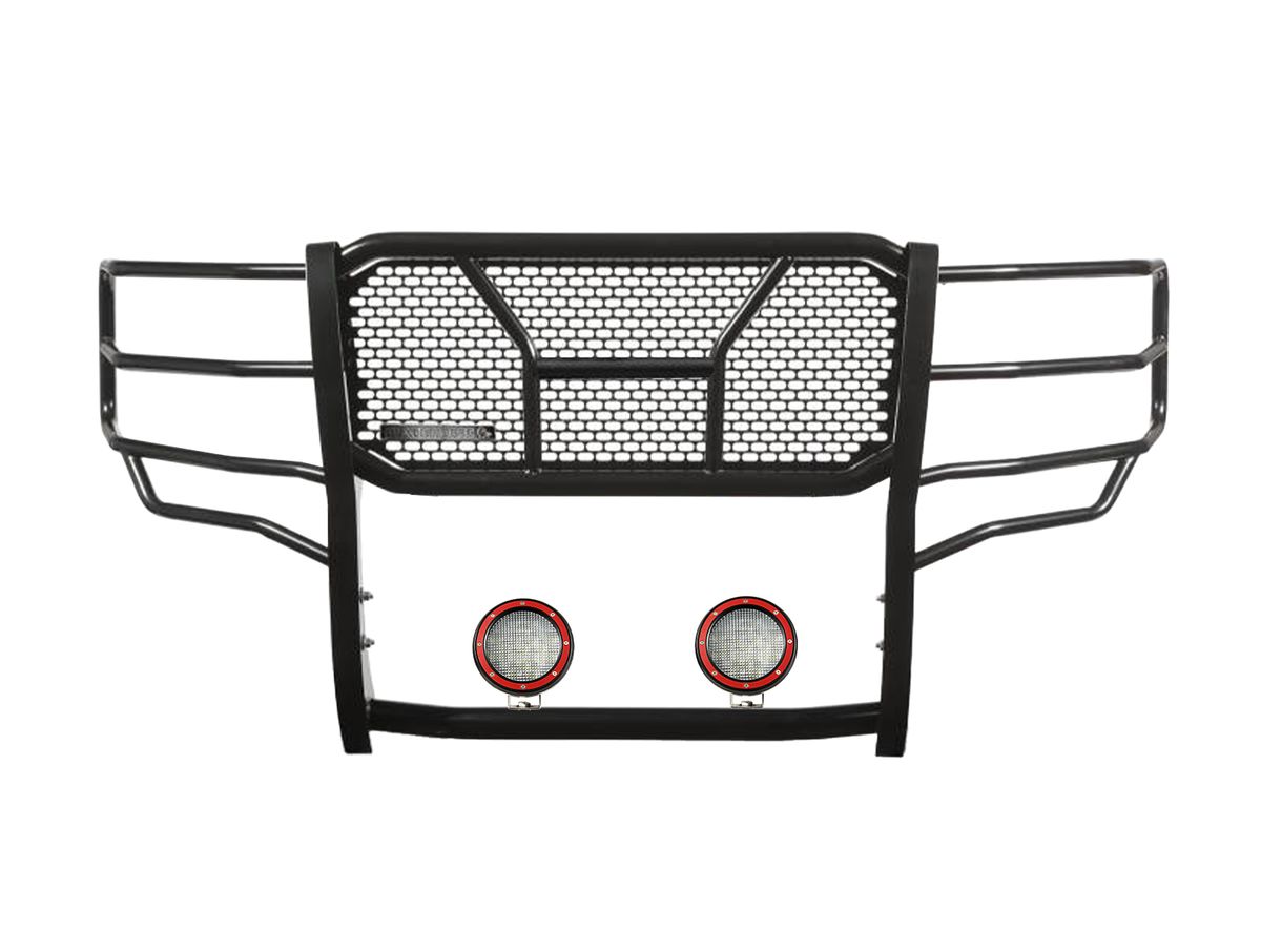 The Rugged Grille Guard from Black Horse Offroad is made from high-strength steel with a 2.5" heavy-wall tube design and is finished in a semi-gloss black powder-coat. This grille guard comes in a modular design, has removable headlight cages, and features available kitted options that include your choice of 20" LED Light Bar, or a pair of 5" or 7" Round LED lights!