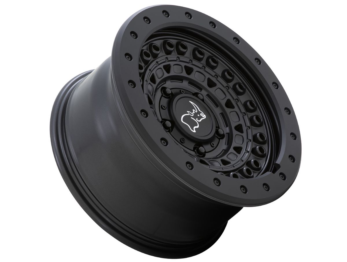 The wheel is covered in a gun black finish with a black beadlock ring and bolts. The inset center cap is adorned with the Black Rhino logo to complete the look.