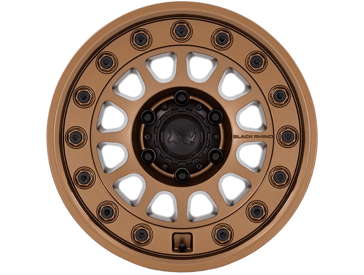 The short spokes terminate on an outer lip that contains spacious, easy-to-clean hardware. The wheel is covered in a matte bronze finish that is enhaced by the large military inspired bolts. The center cap is adorned with the Black Rhino logo to complete the look.