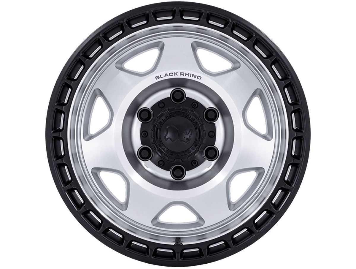 The wheel is covered in a silver machined finish that is enhanced by the matte black debris release ring. The center cap is adorned with the Black Rhino logo to complete the look.