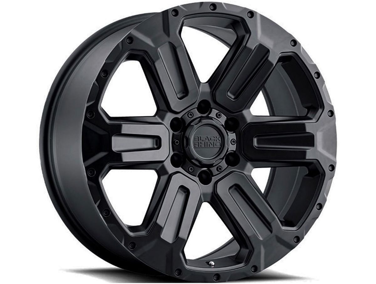 The spokes create the illusion of being split with the deep contured pouch down the center. The wheel is covered in a matte black finish that is offset with spot milled accents around the outer edge. The center cap is adorned with the Black Rhino logo to complete the look.