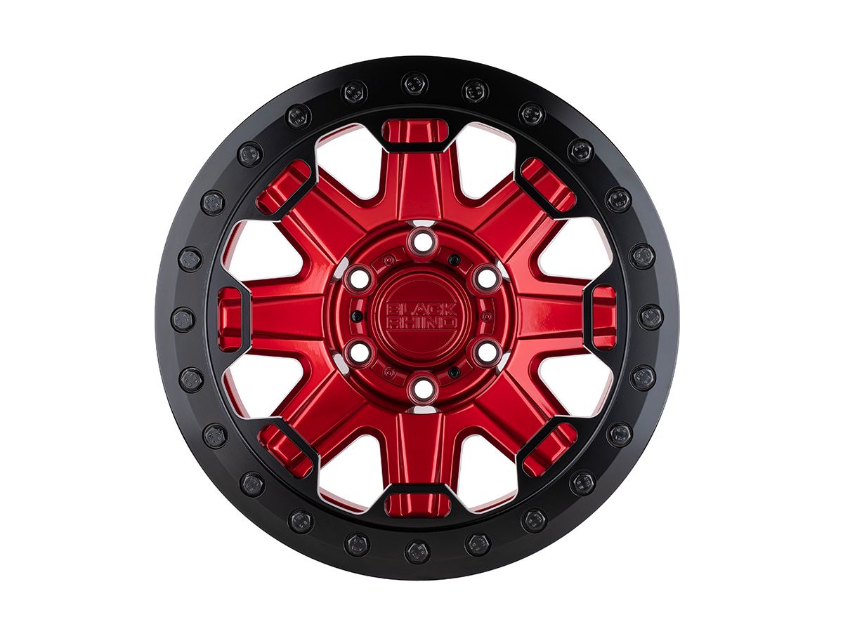 The Black Rhino Red and Black Rift Beadlock Wheels feature an all-new and more aggressive TYPE-B beadlock ring. The thick, eight spokes are protected by windows that extend from the beadlock ring into the center. These wheels are covered in a candy red finish with a black beadlock ring and black bolts. Additionally, these wheels are balanced out by an exposed lug center that is stamped with the Black Rhino logo on the cap to help create the final look.