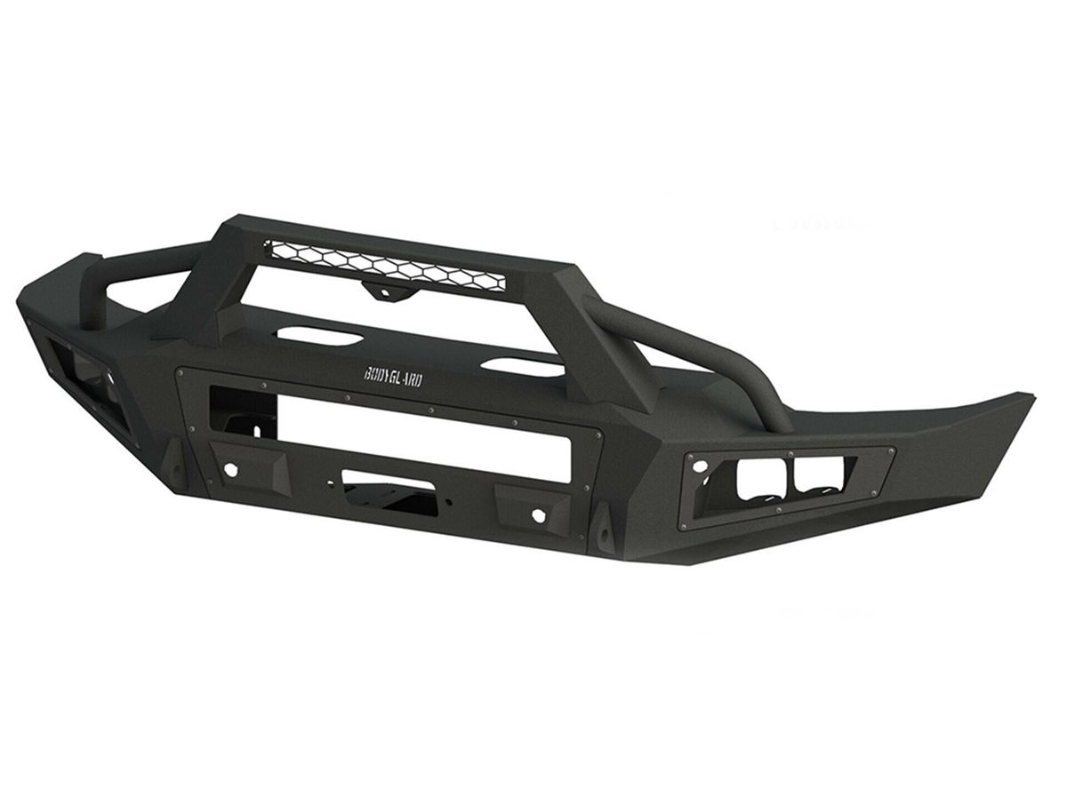 Upgrade your stock truck bumper with a Bodyguard A2 Sport Front Bumper. This beast is built with heavy duty 3/16" plate steel and comes with an aggressive sport guard that features a cutout for one 20" Single Row LED Light Bar, and a skid plate that includes a cutout for a 30" Double Row LED Light Bar, optional cutouts for parking sensors (if applicable), a winch mount, and a pair of D-Ring Shackle mounts are built right into the bumper! Bodyguard test fits its bumpers with Rigid off-road lights and recommend using a Rigid E-Series 30" LED Light Bar for the skid plate and a Rigid 20" SR-Series LED Light Bar for the sport bar.