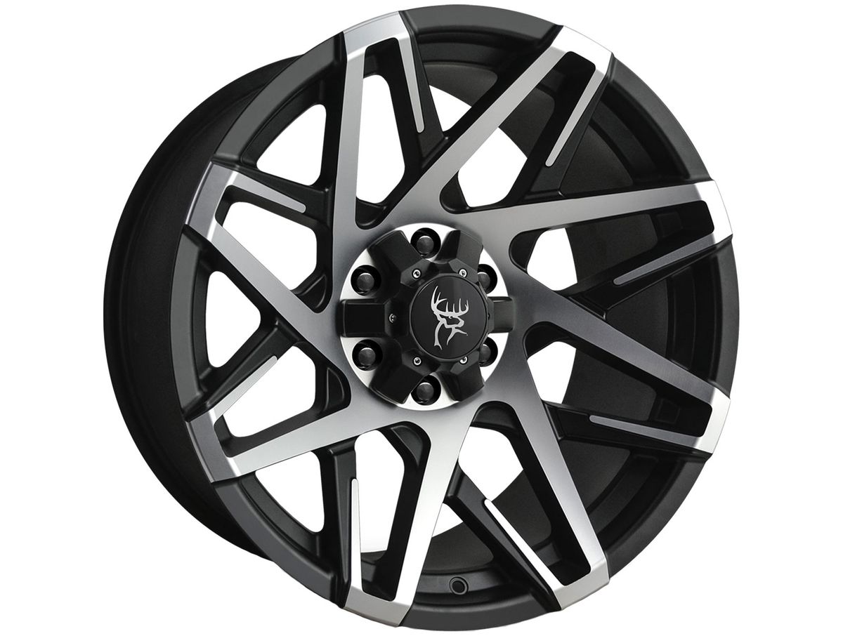 The spokes are split with a narrow window creating depth and contour. The wheel is covered in a satin black finish with machined face accents. The center cap is adorned with the Buck Commander® logo to complete the look.