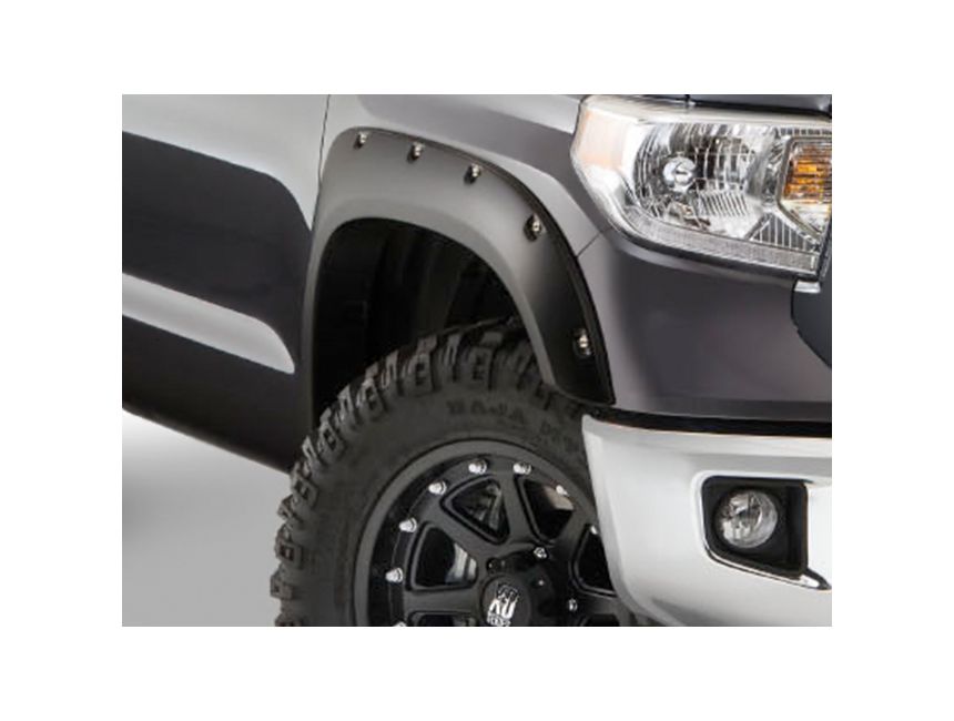Bushwacker pocket style fender flares feature a rugged, off-road-inspired aesthetic. Recessed pockets with faux stainless-steel fasteners line the perimeter of each flare, giving an aggressive "bolt-on" appearance. However, no modifications are required on most applications.