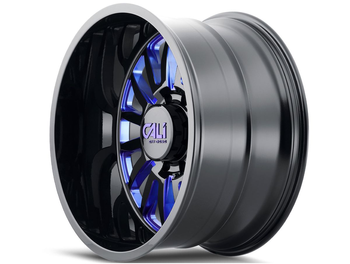 Built to last, each wheel is made of a durable cast aluminum in a one-piece construction. The wheel is covered in a gloss black finish that is offset by the blue milled spoke accents. The center cap is adorned with the Cali Offroad logo to complete the look.