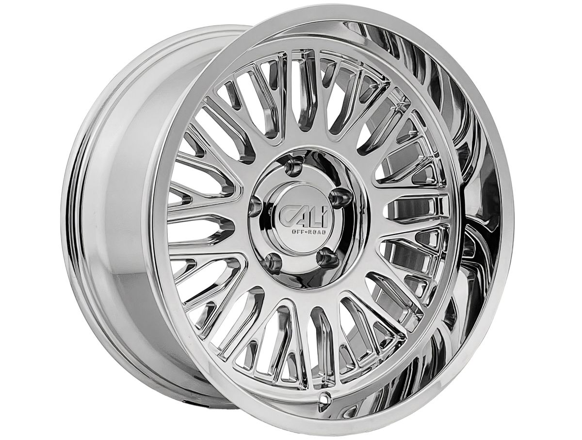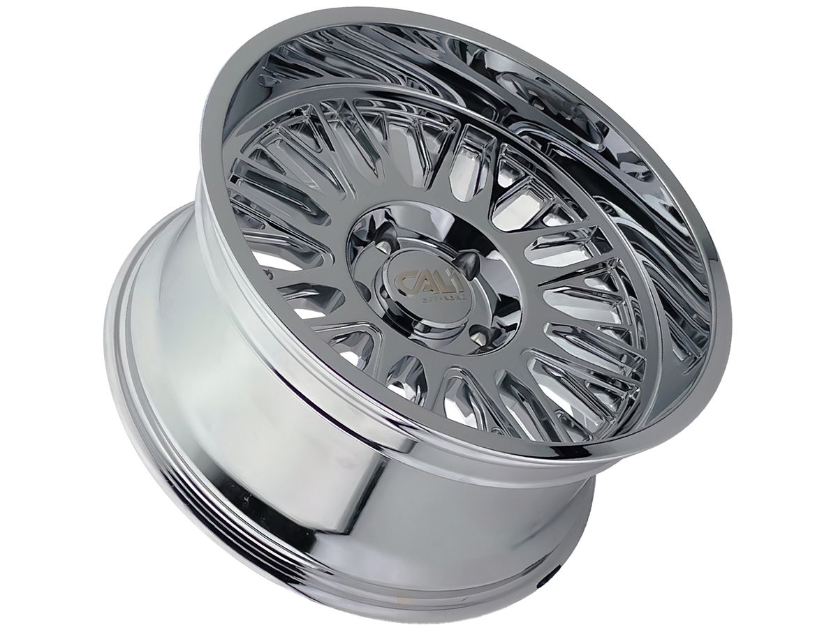 The wheel is covered in a chrome finish that is enhanced by intricate milling on the spokes. The center cap is adorned with the Cali Offroad logo to complete the look.