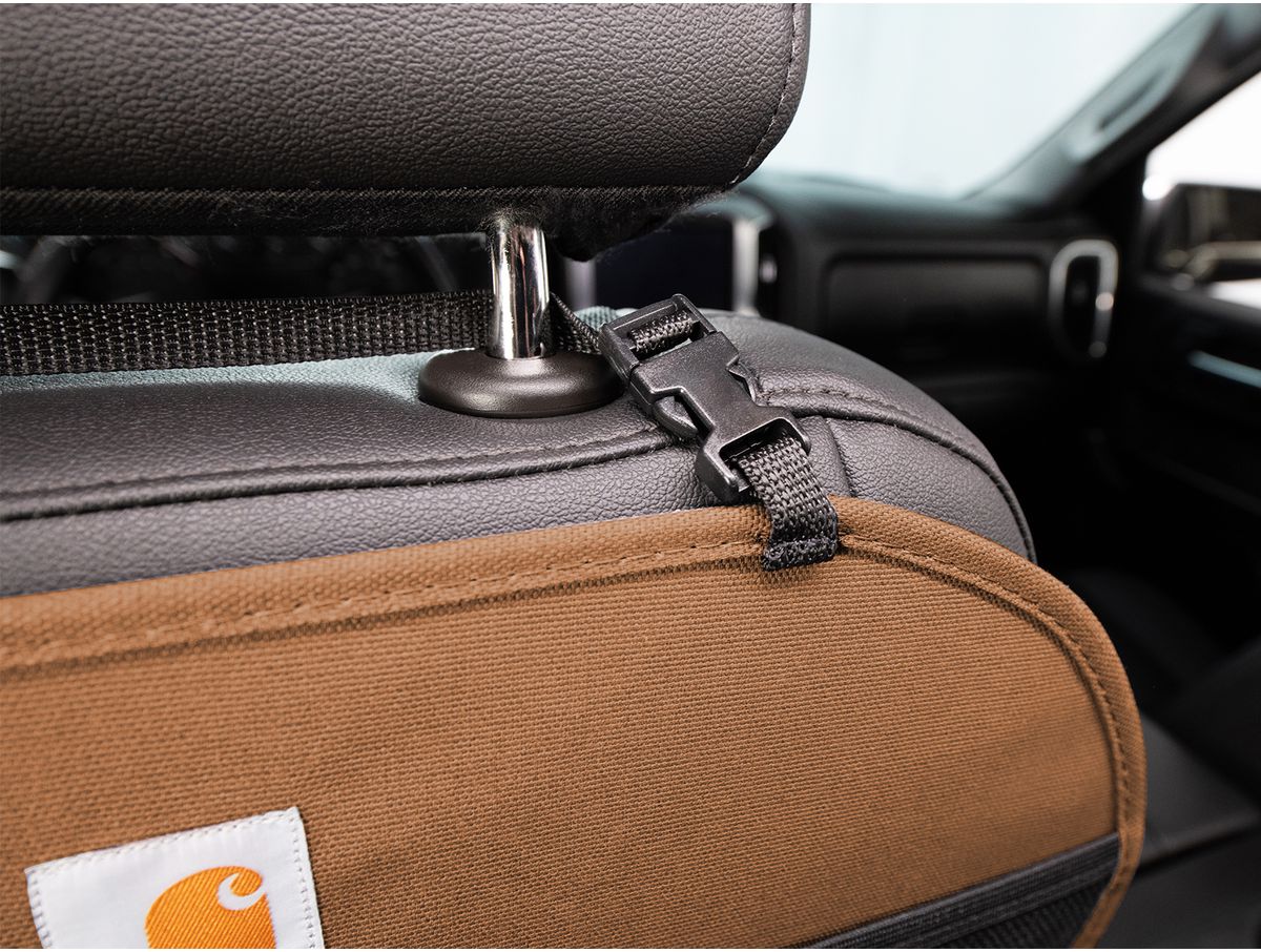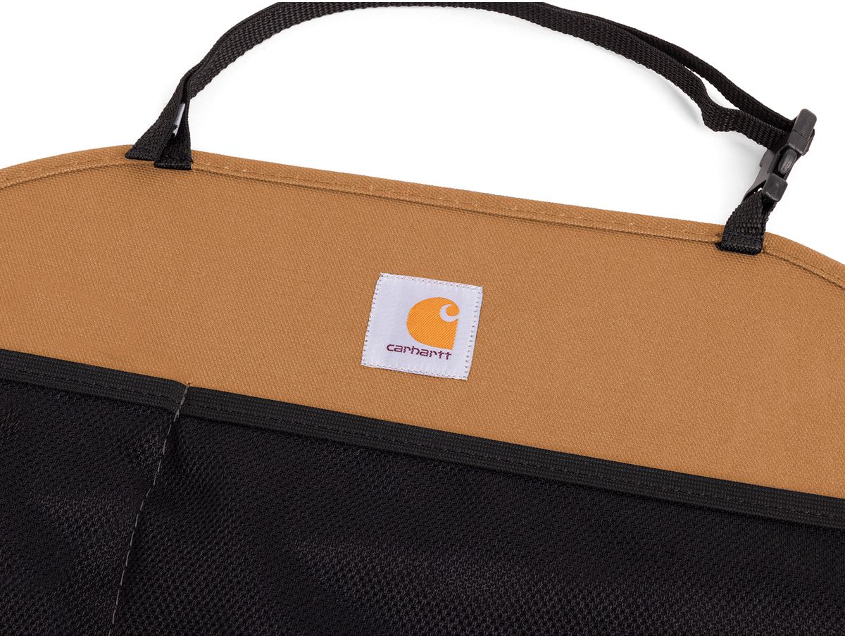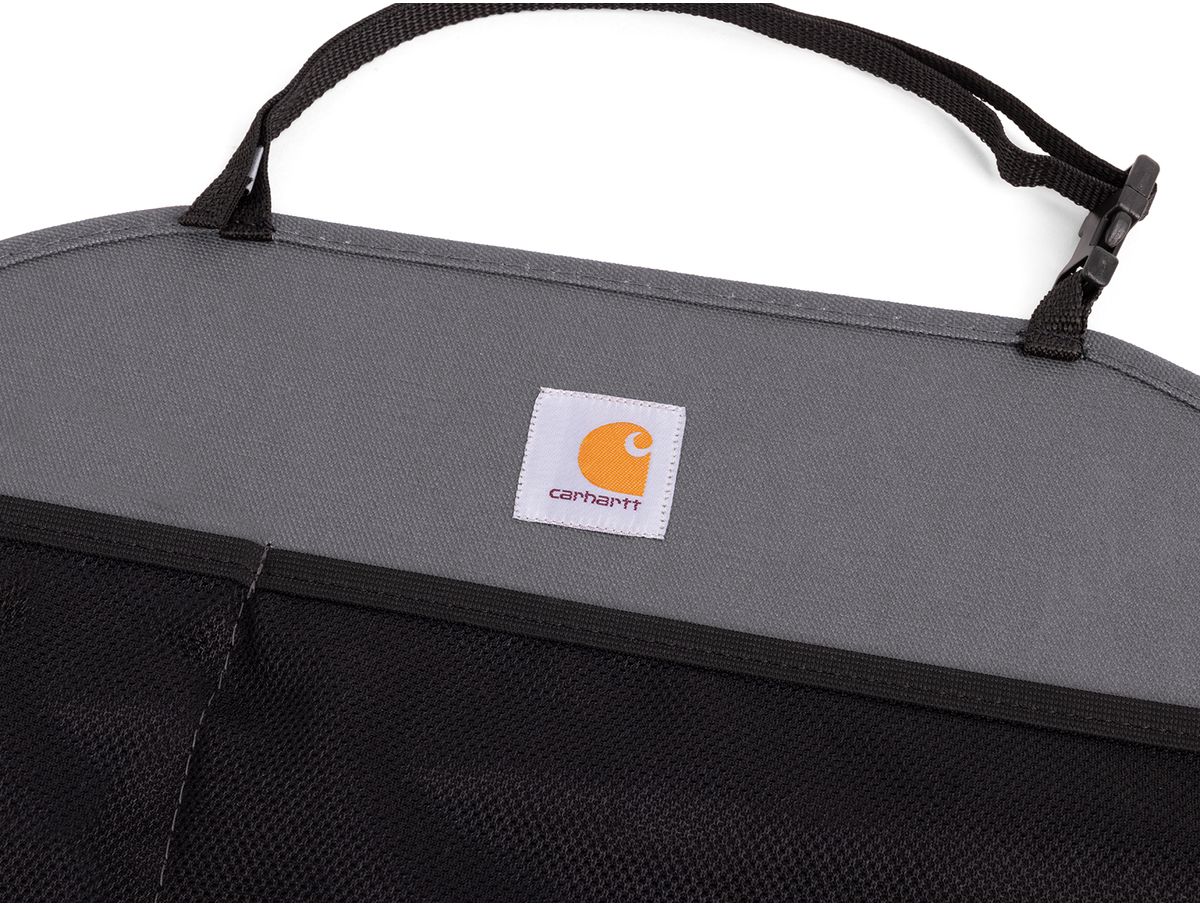 The Covercraft Carhartt seatback organizer installs easily over your seat with straps and buckles.