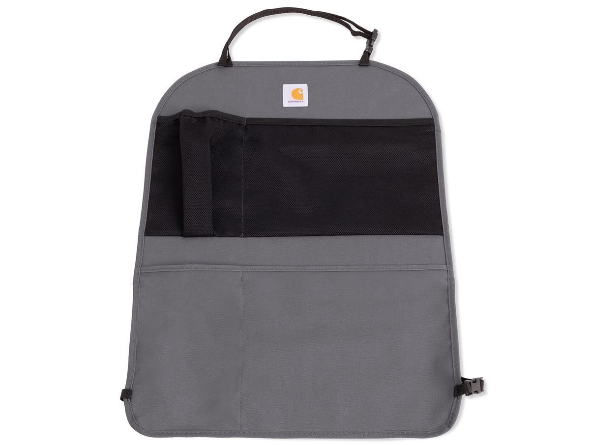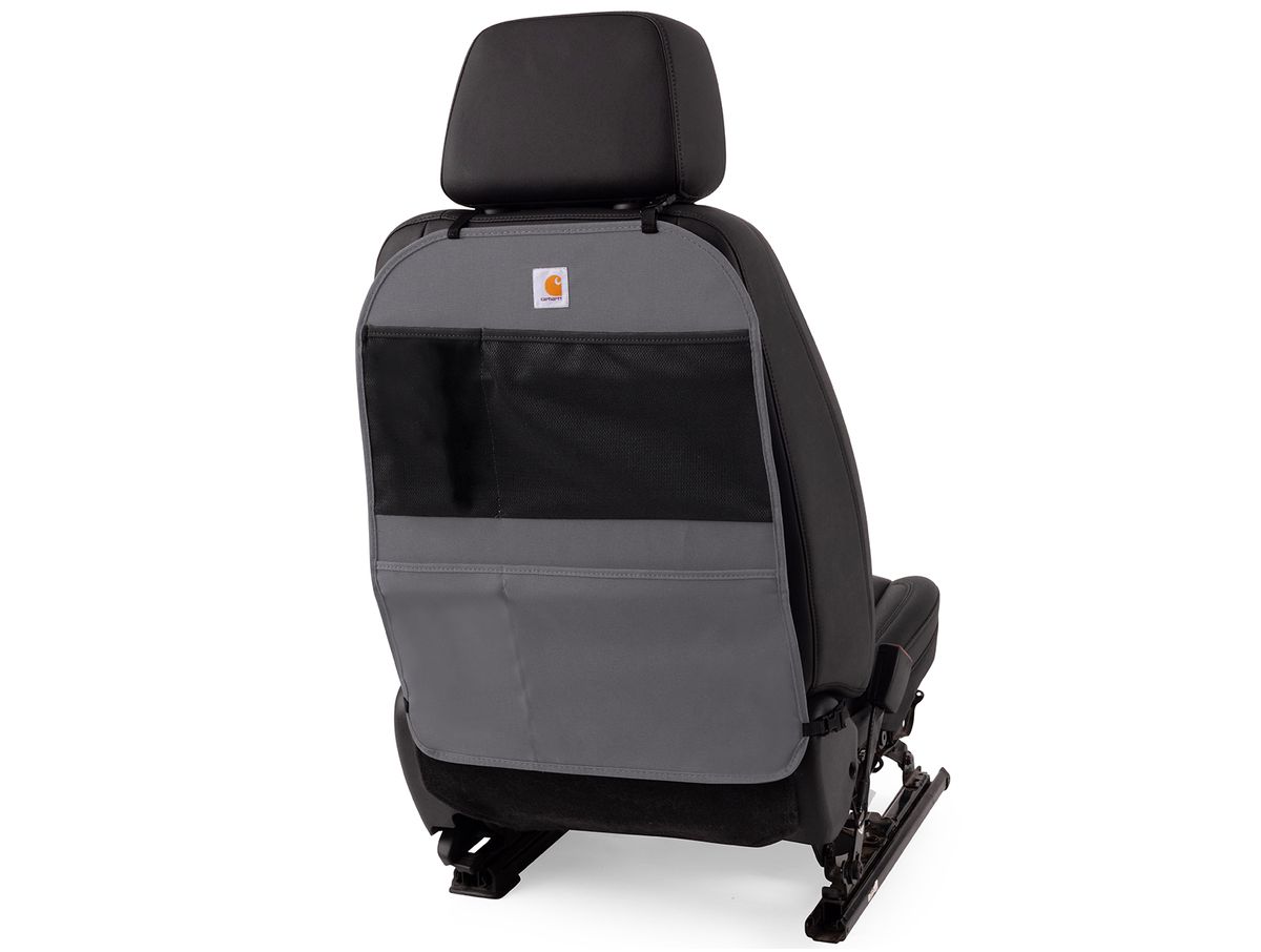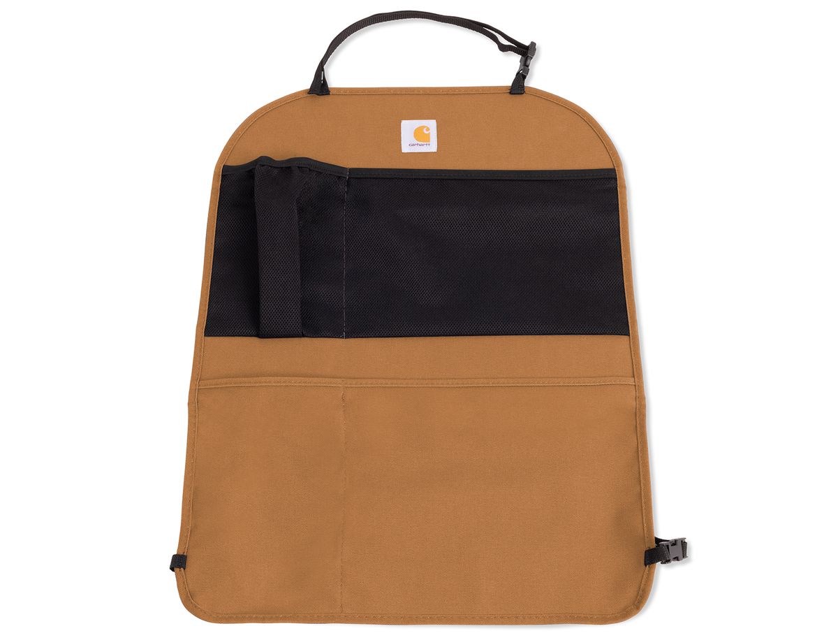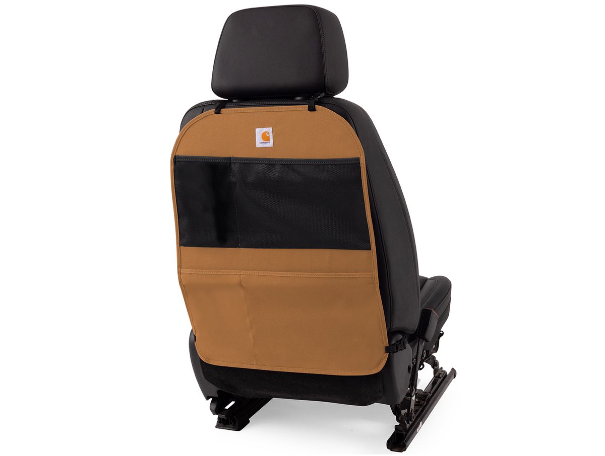 It is designed to hold up to the abuse of being kicked over-and-over while adding some much-needed organization to your vehicle. Each cover is made from a super strong Carhartt® Duck Weave fabric to prevent stains, mud, snow, spills, and scuff marks from ruining your seats. For added storage, each protector includes four pockets - two mesh pockets with an elastic top and two reinforced water-resistant pockets great for packing away snacks, toys, tools, or games. The duck weave fabric is water resistant and has triple stitched main seams for a strong construction. It attaches quickly with straps and buckles and is also machine washable. It is universal and fits most vehicles. It measures 18.5 inches x 23.5 inches. It comes in your choice of Carhartt brown or gravel which will match your Carhartt seat covers perfectly. Each seatback organizer is sold individually, backed by a 2-year warranty, and is made in the USA!