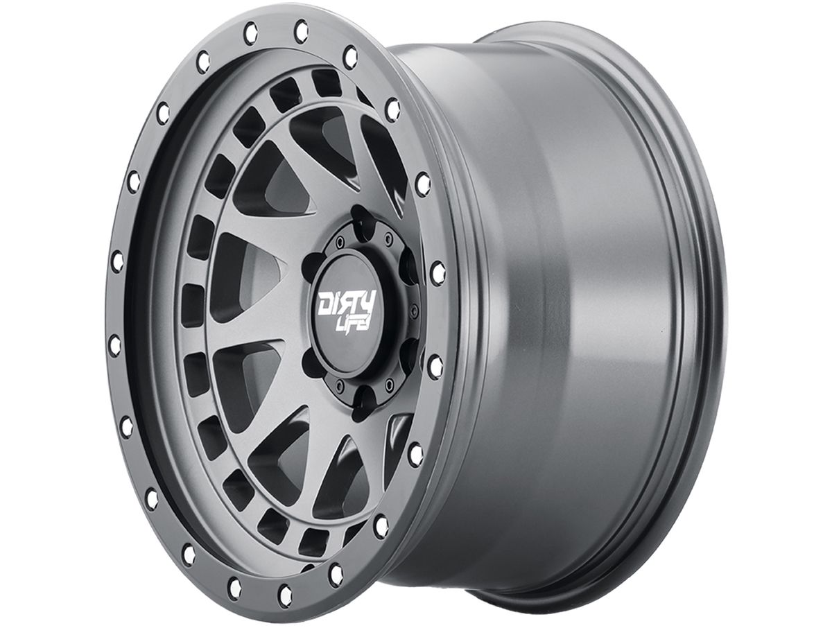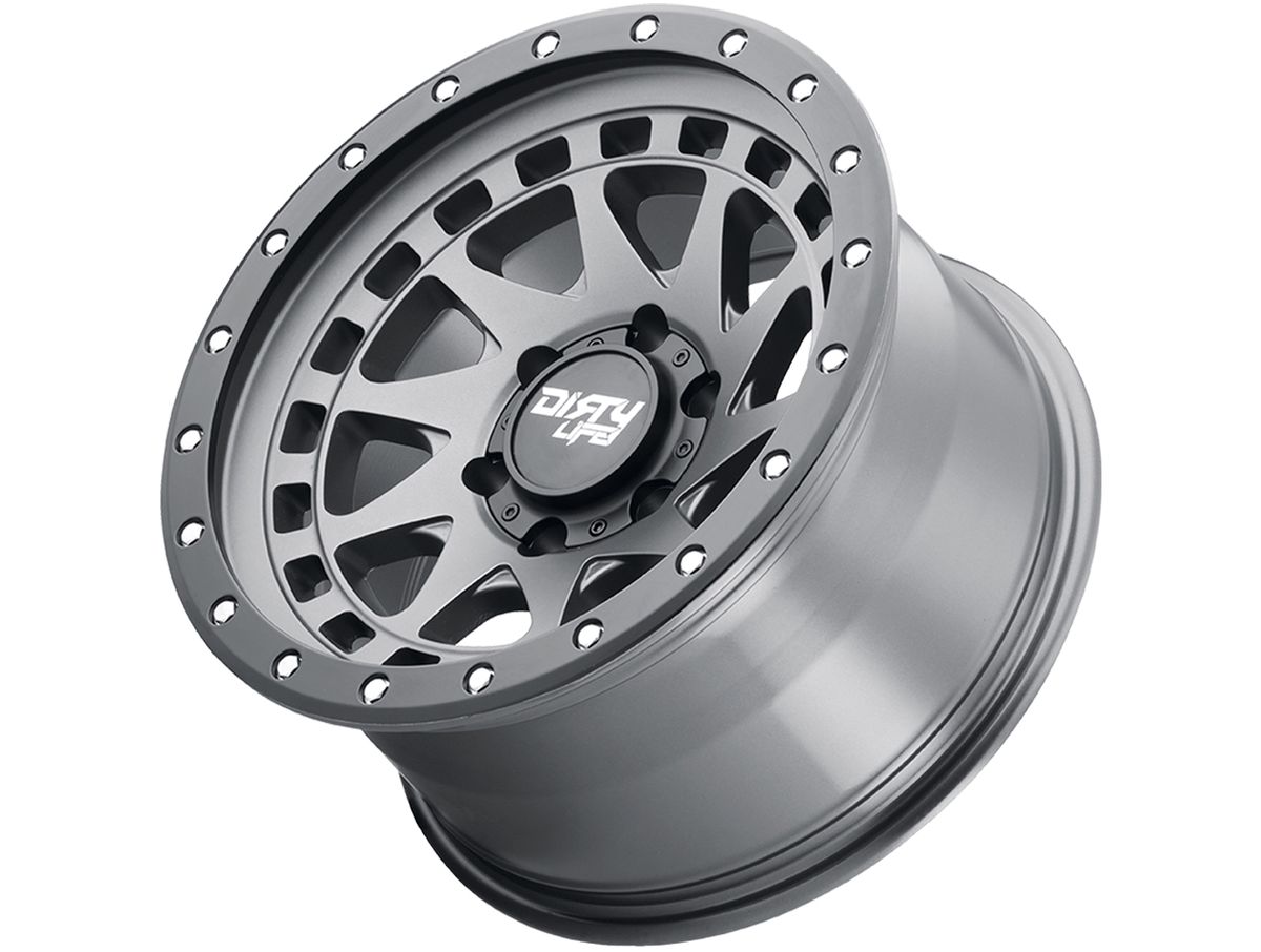 The spokes are designed with a directional look that gives the wheel the illusion of rotation. The wheel is covered in a satin graphite finish that is enhanced by a black, simulated beadlock ring. The center cap is adorned with the Dirty Life logo to complete the look.