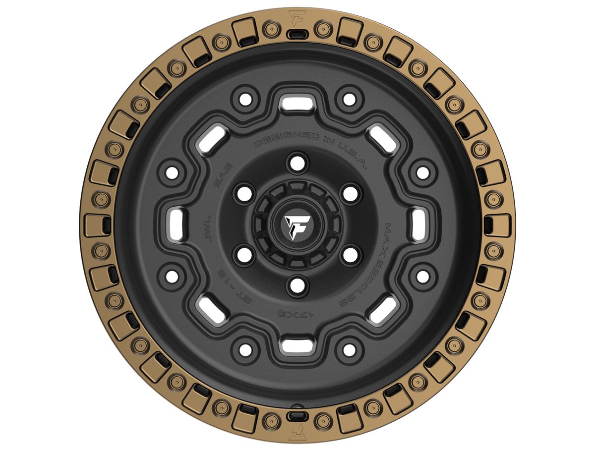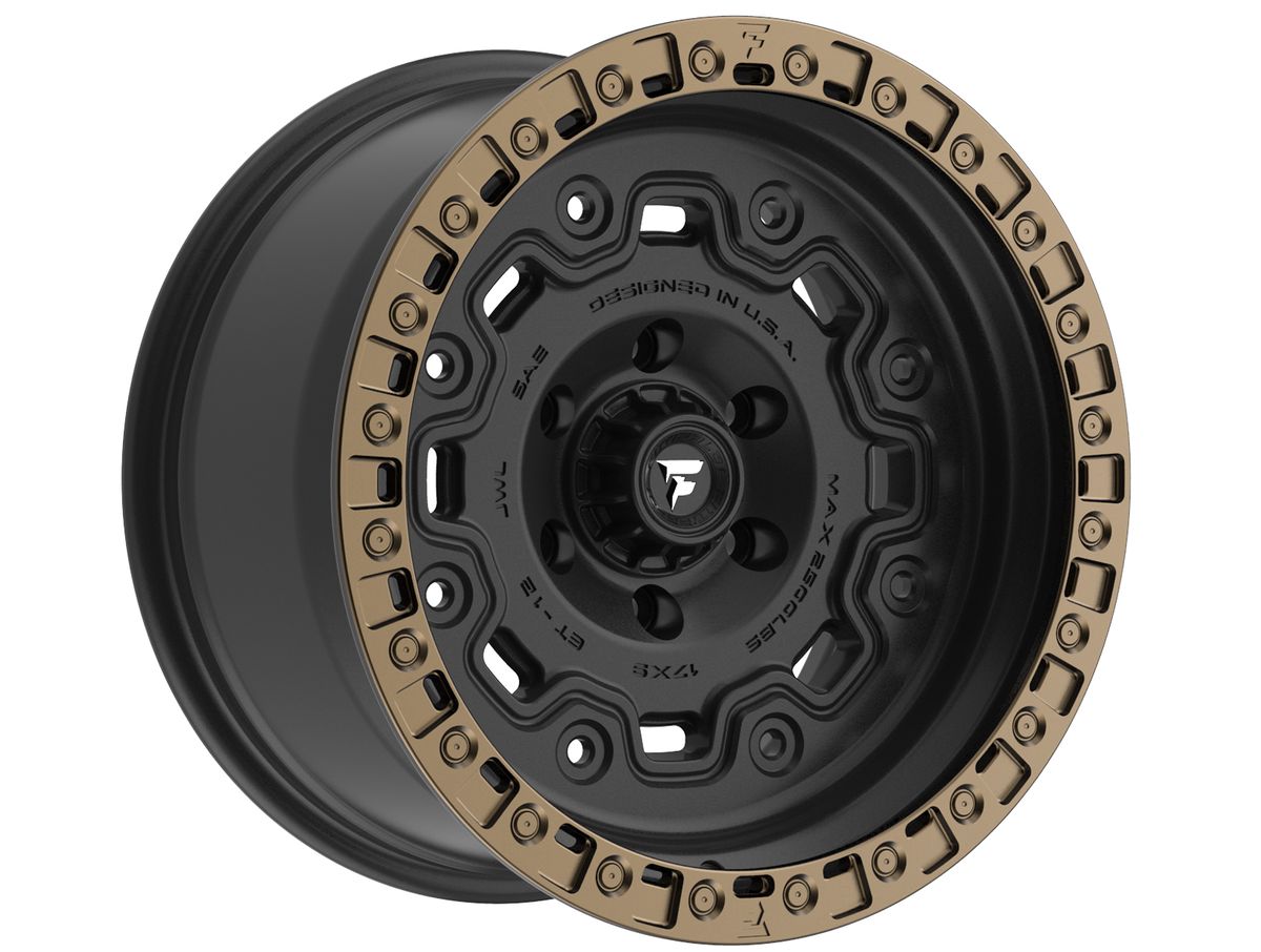 Fittipaldi Off-Road Matte Black & Bronze FT100 Wheels feature a rugged tactical aesthetic to match its industrial, armored structure. The military inspired design contains eight alternating windows and holes. The simulated beadlock ring comes with a true undercut flange and drainage holes. Race wheels and rugged designs are what Fittipaldi Off-Road specialize in, and the FT100 puts those features on display.