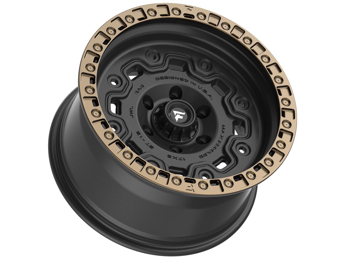 The wheel is covered in a satin black finish that is enhanced by the bronze simulated beadlock ring. The center cap is adorned with the Fittipaldi Off-Road logo to complete the look.