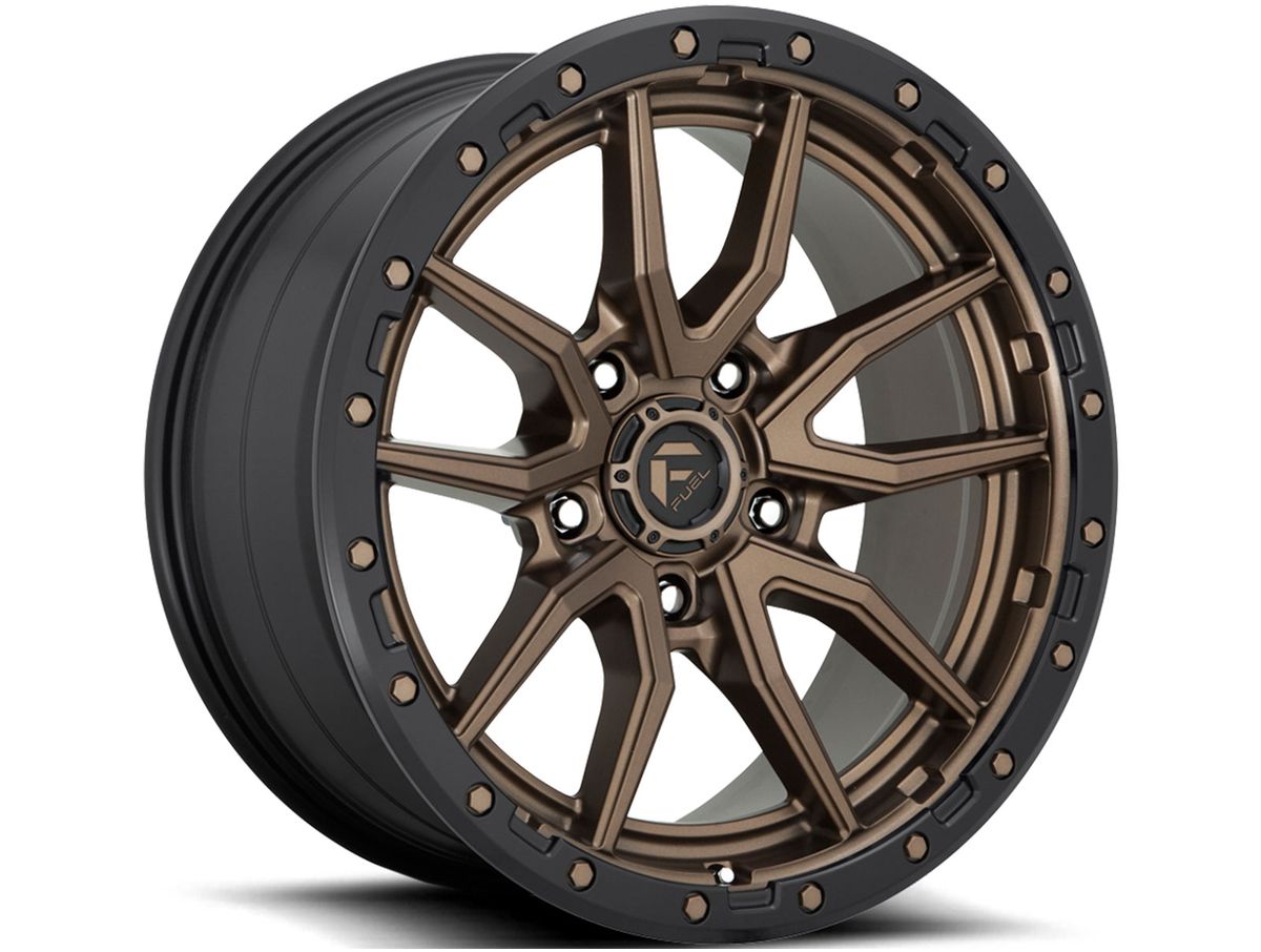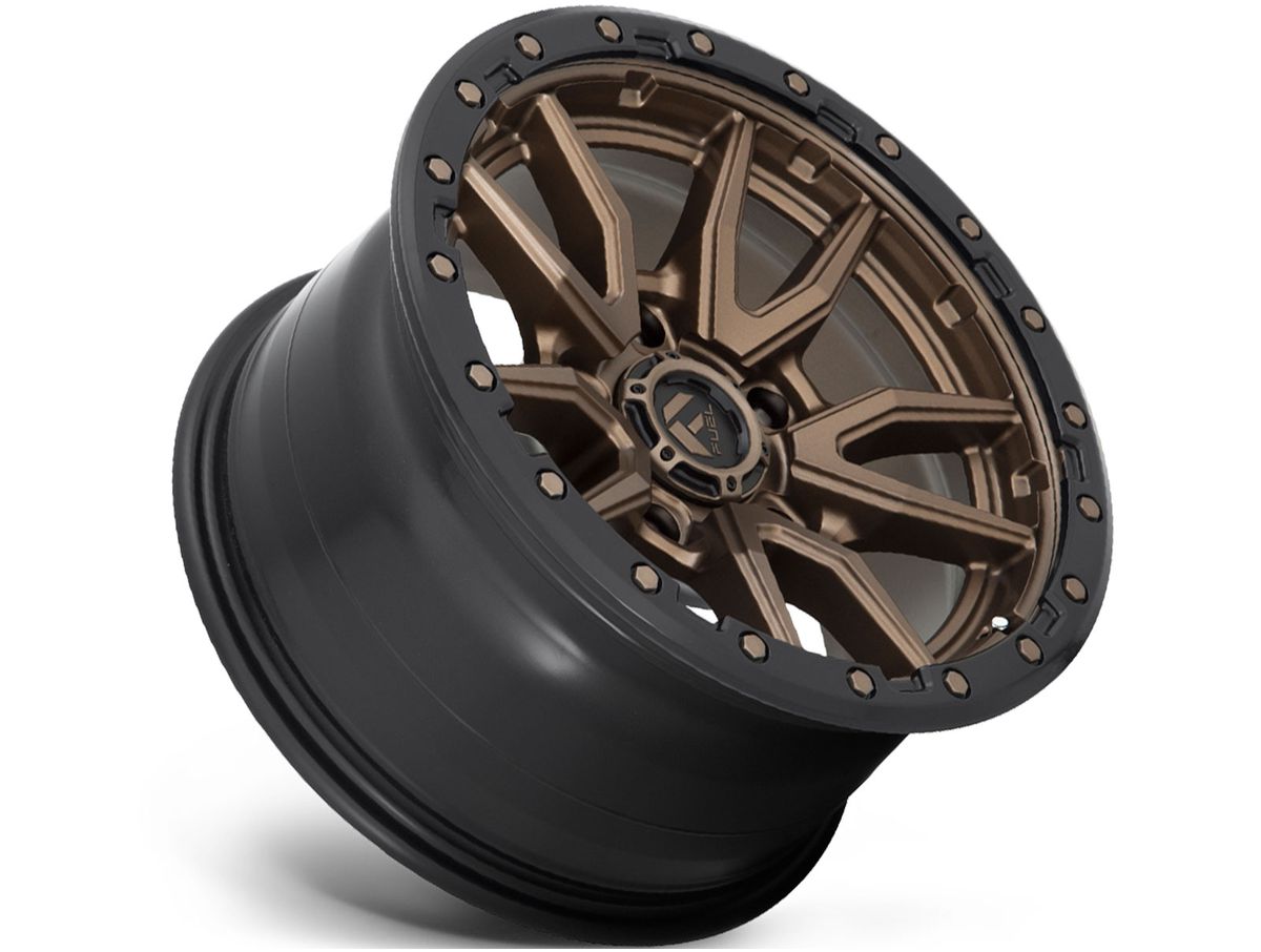 Each spoke features smooth faces that wrap towards the center of the wheel and meet at the center cap. The wheel is covered in a matte bronze finish that is offset by the black simulated beadlock bead ring around the outer edge. The center cap is adorned with the Fuel logo to complete the look.