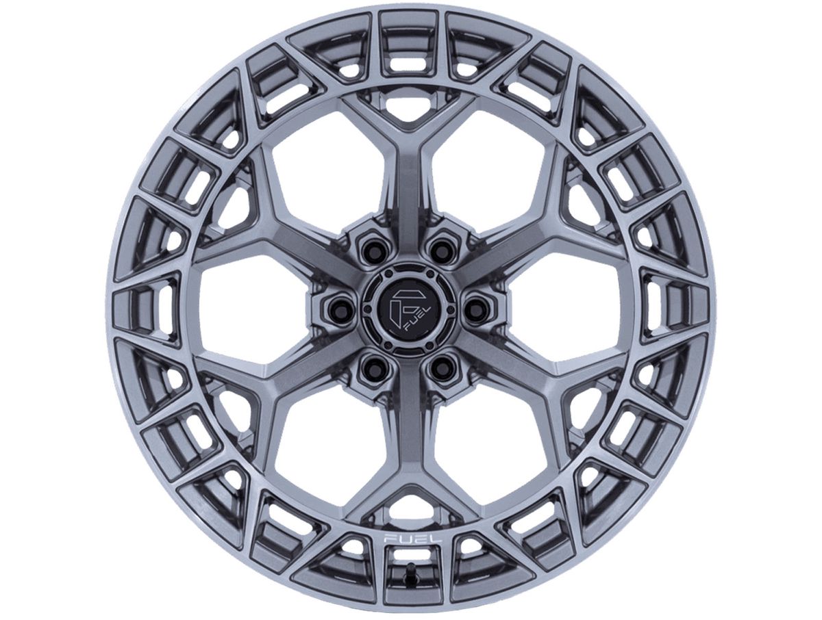 The wheel is covered in a platinum finish that is enhanced by they complex outer ring. The center cap is adorned with the Fuel logo to complete the look.