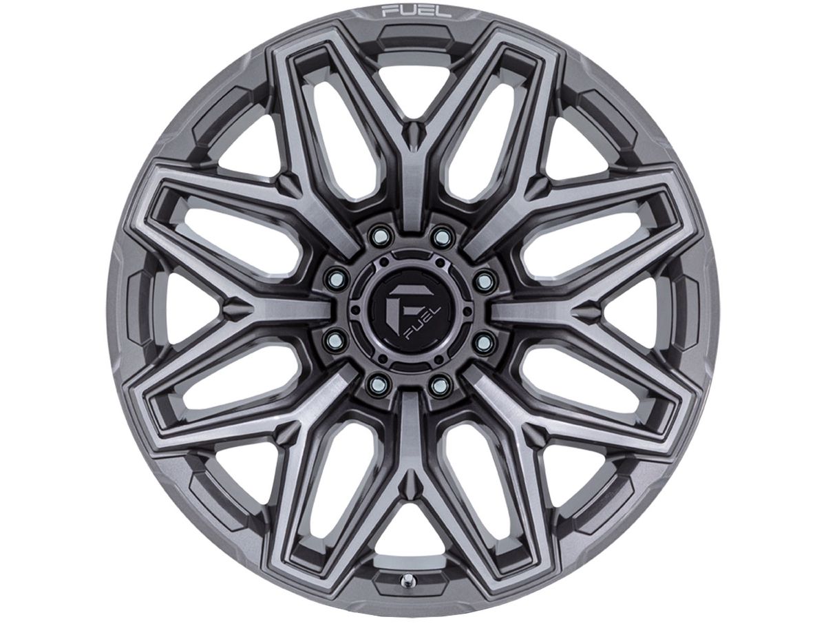 Fuel Grey Flux 8 Wheels feature an aggressive concave style and 8 y-spokes that fill up the center and leaves a window with sharp angles. The spokes are y-shaped and create contours as they meet at the wheel lip. Off-road styles and large diameters are what Fuel specializes in, and the Flux puts those features on display.