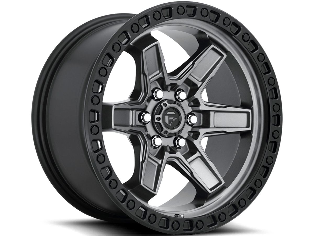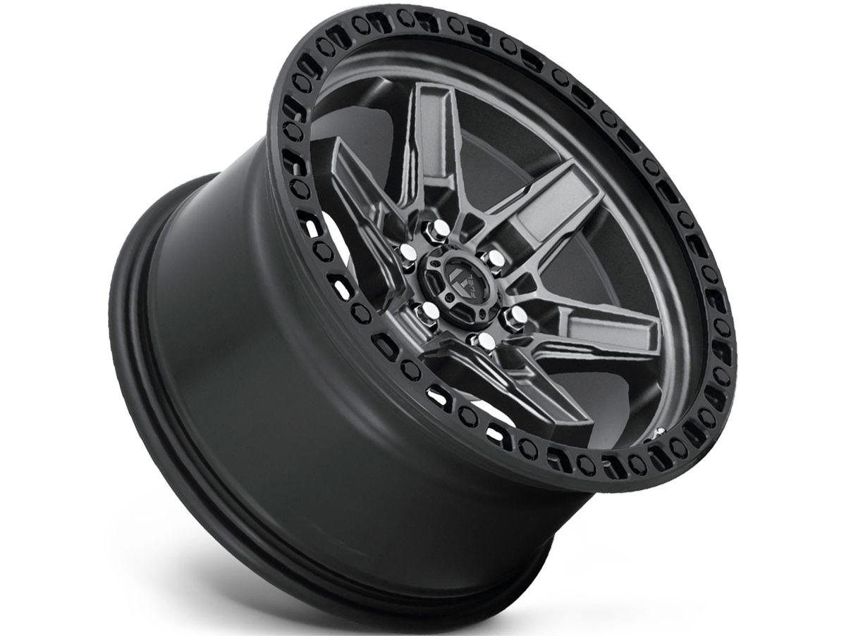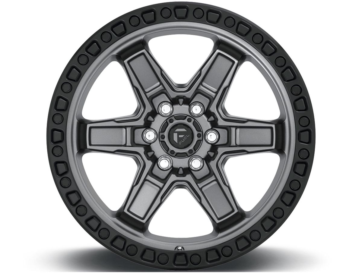 Each spoke features contours and sharp angles that cover the center of the wheel and meet at the center cap. The wheel is covered in a matte grey finish that is offset by the black simulated beadlock bead ring. The center cap is adorned with the Fuel logo to complete the look.