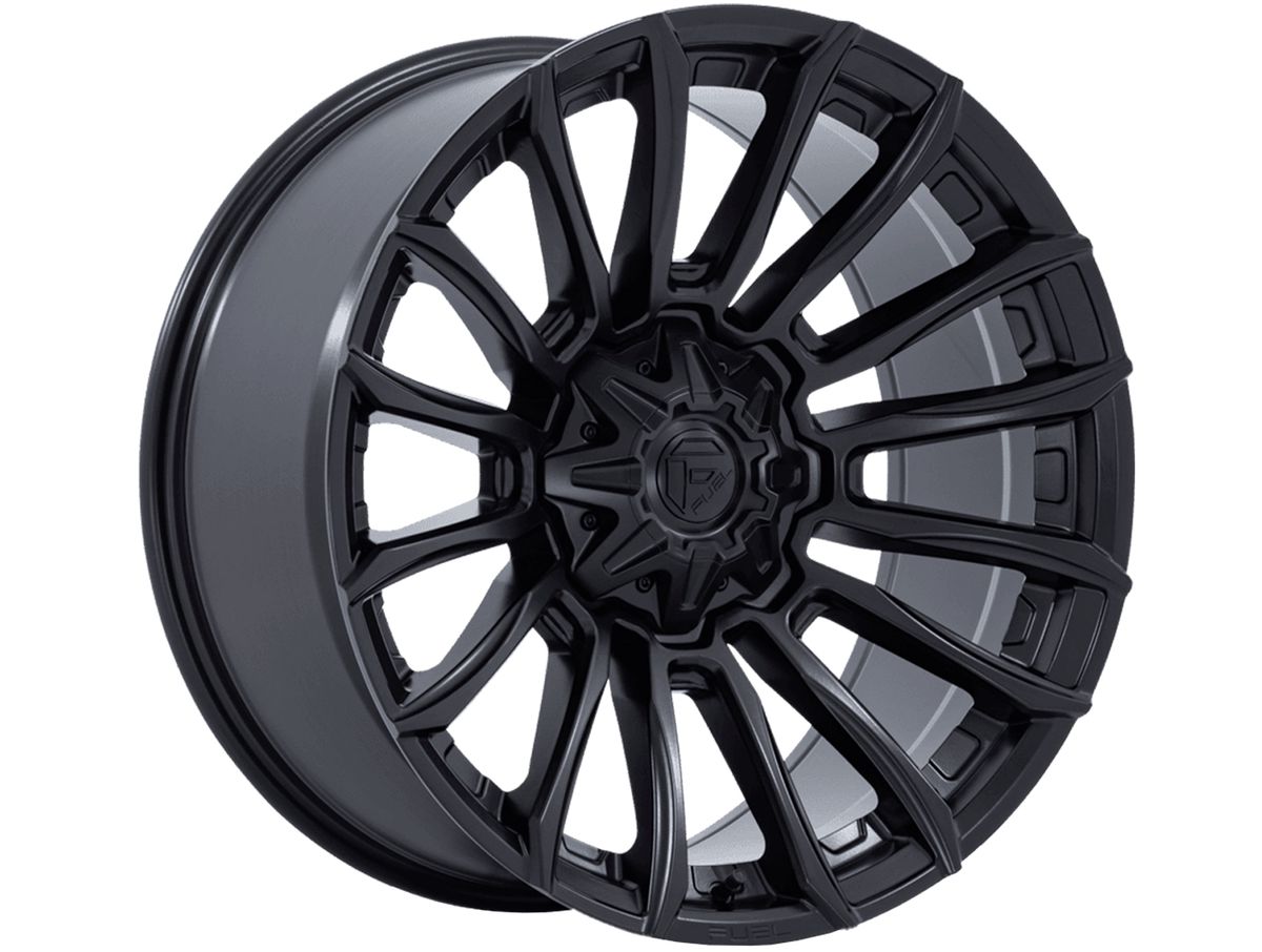 The wheel is covered in a matte black finish that is enhanced by the detailed spoke design. The center cap is adorned with the Fuel logo to complete the look.