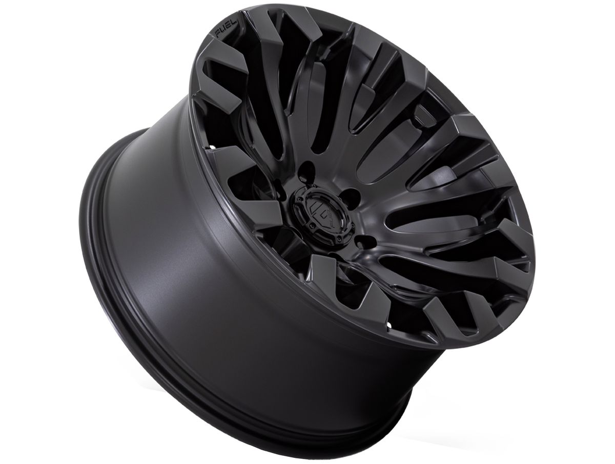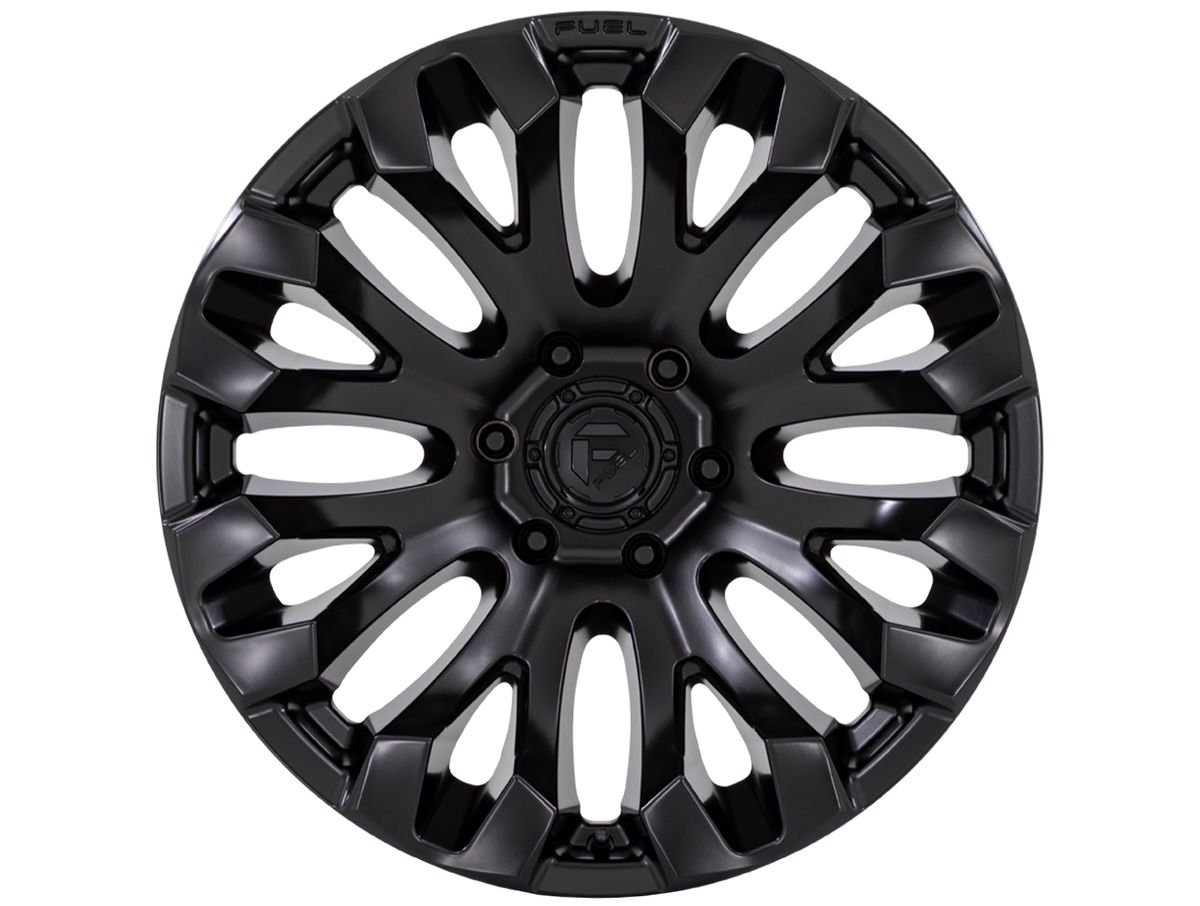 The spokes are split with a narrow window creating depth and contour. The wheel is covered in a matte black finish that is complimented by the milled black accents on the spokes. The center cap is adorned with the Fuel logo to complete the look.