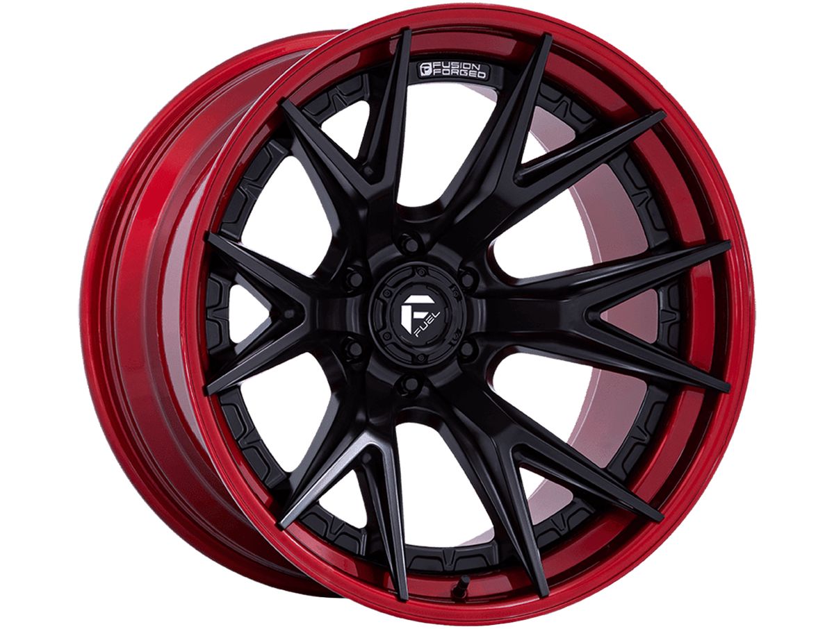 The wheel face is covered in a matte black finish that is enhanced by the candy red lip and barrel. The center cap is adorned with the Fuel logo to complete the look.