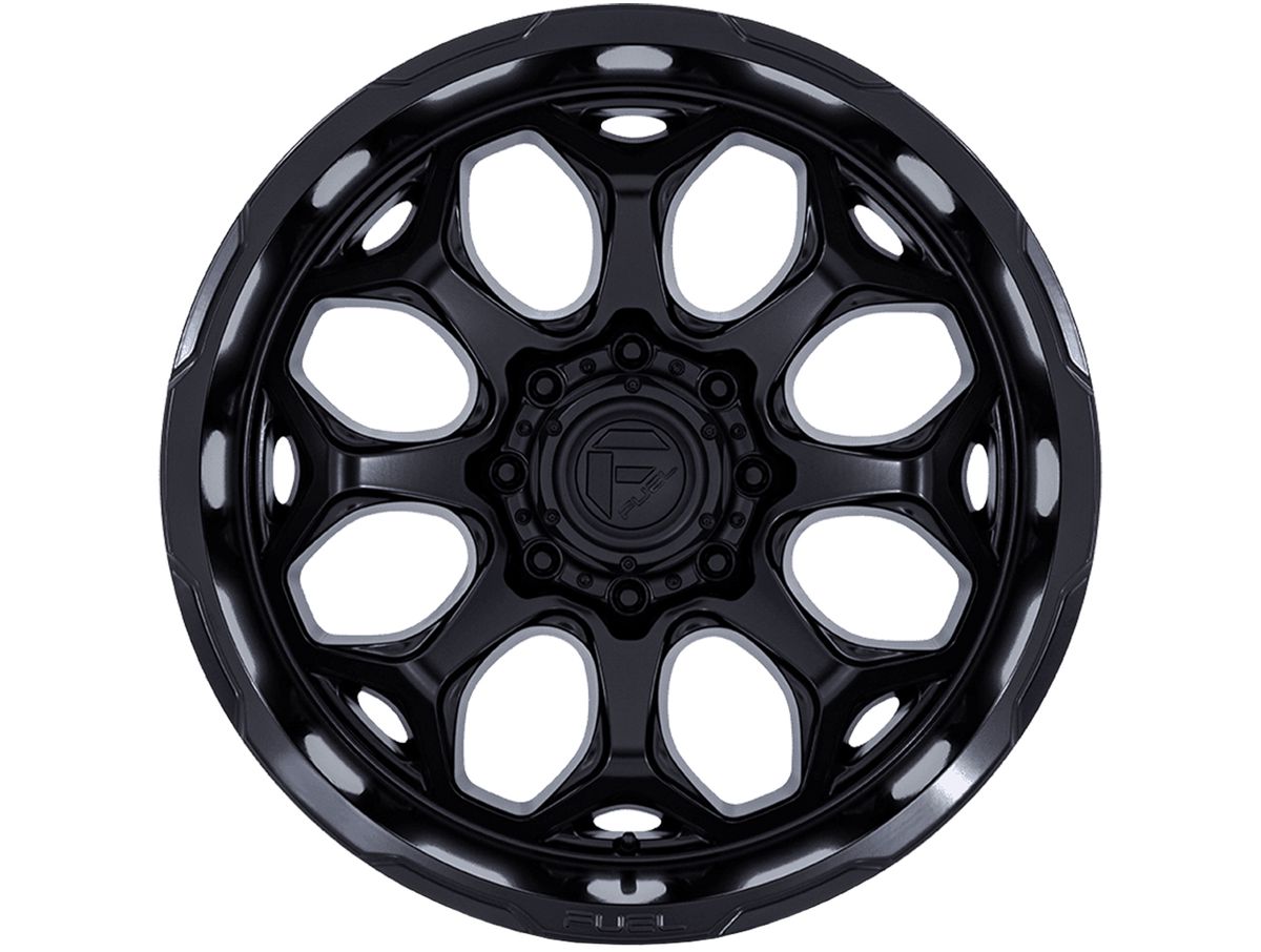 The wheel is covered in a blackout finish that is enhanced by painted milling in the spoke windows and around the outer lip. The center cap is adorned with the Fuel logo to complete the look.