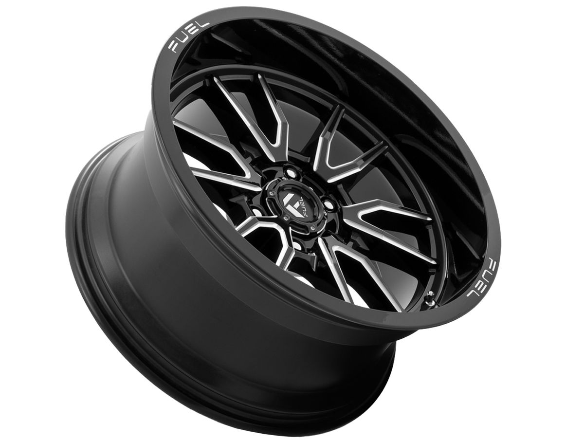 The wheel is covered in a gloss black finish that is offset by the milled spokes and milled logo on the outer lip. The center cap is adorned with the Fuel logo to complete the look.