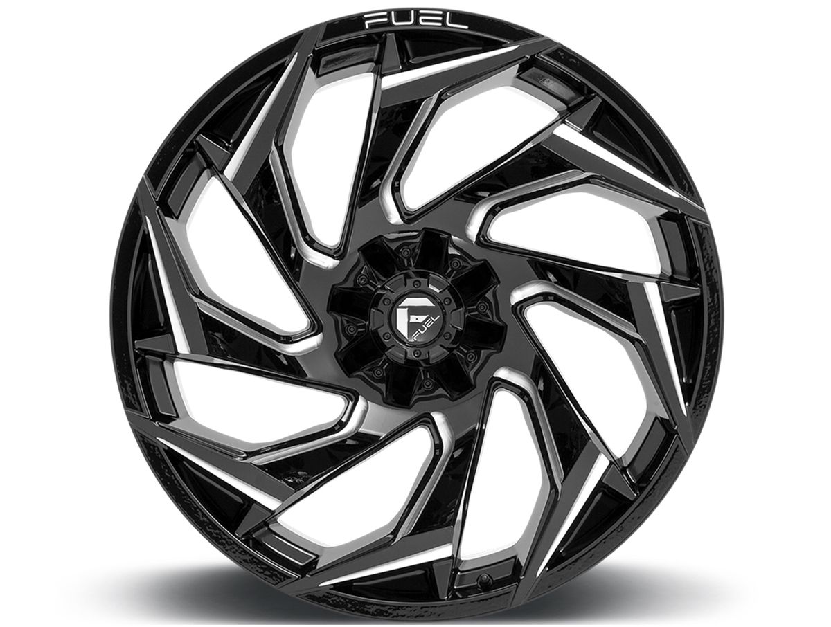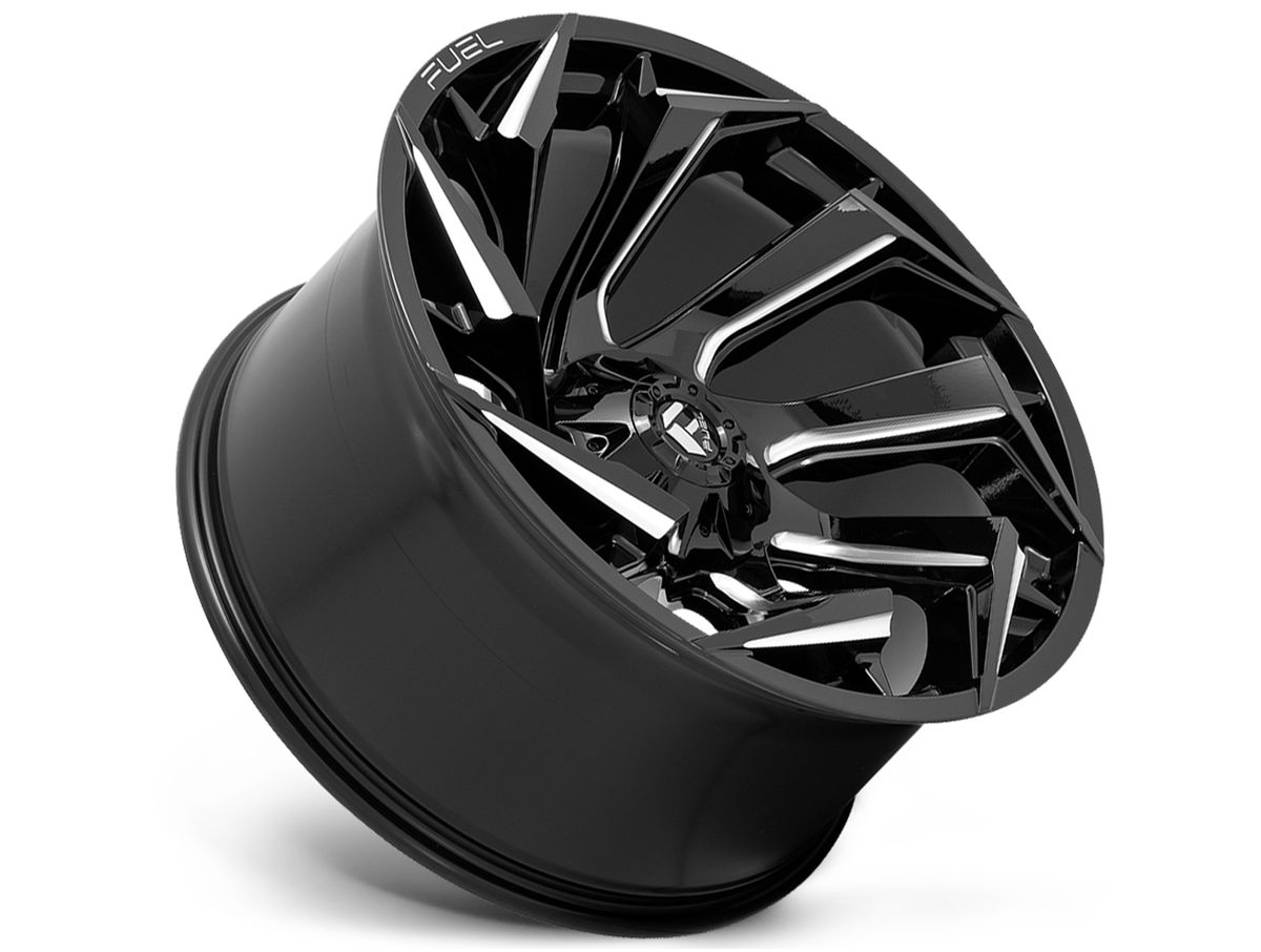 The wheel is covered in a gloss black finish that is enhanced by milled accents. The angled spokes flow seemlessly into the outer ring in a directional pattern. To complete the look, the center cap is adorned with the Fuel logo.