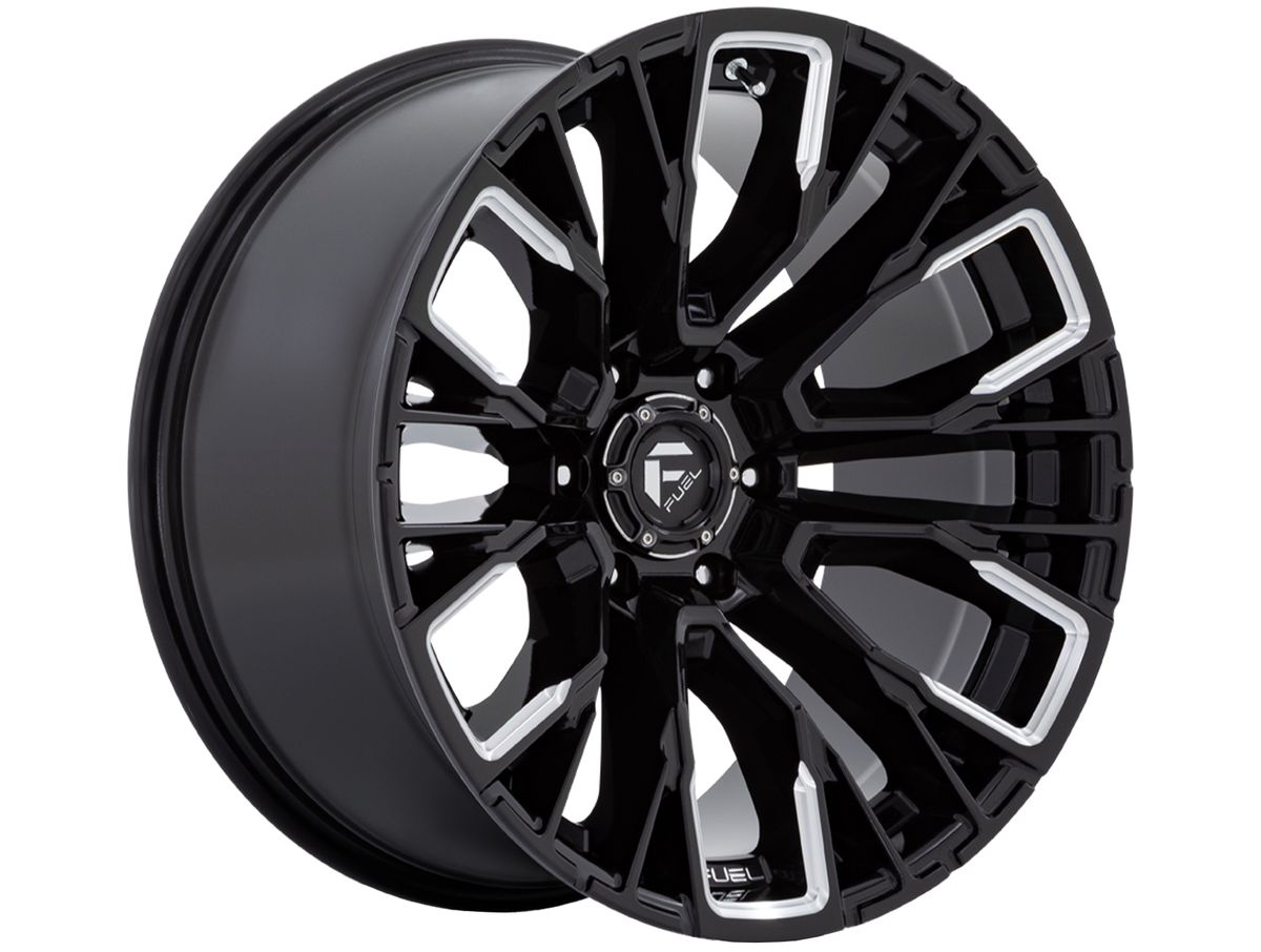 The spokes are split with various sized windows creating complextity and originality. The wheel is covered in a gloss black finish that is enhanced by milling in the spoke windows. The center cap is adorned with the Fuel logo to complete the look.