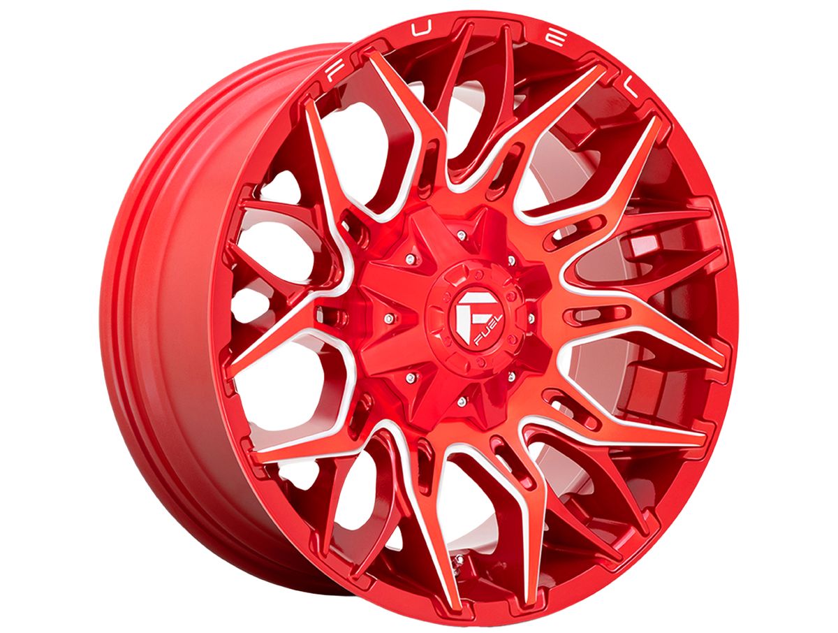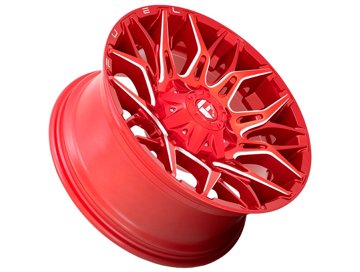 The wheel is covered in a candy red finish that is complimented by milled accents on the spokes. The center cap is adorned with the Fuel logo to complete the look.