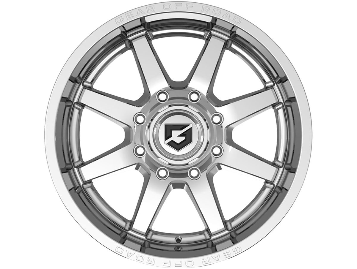 Gear Off-Road Milled Chrome Pivot Wheels feature eight thick spokes that fill up the center and leaves a window with sharp edges. The spokes sport contours to create a one of a kind look. Deep lips and spoked style wheels are what Gear Off-Road specializes in, and the Pivot puts those features on display.
