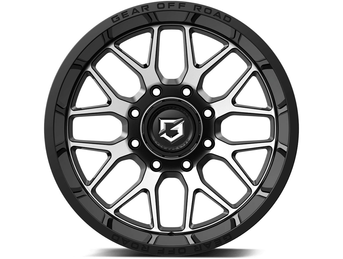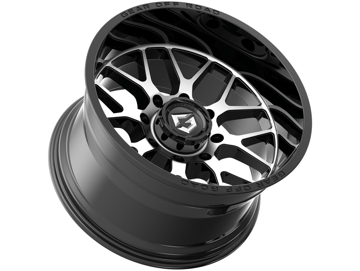 These wheels are made of a durable cast aluminum in a one-piece construction. The wheel is covered in a gloss black finish that is offset with the brand name engraved around the outer edge. The center cap is adorned with the Gear Off-Road logo to complete the look.